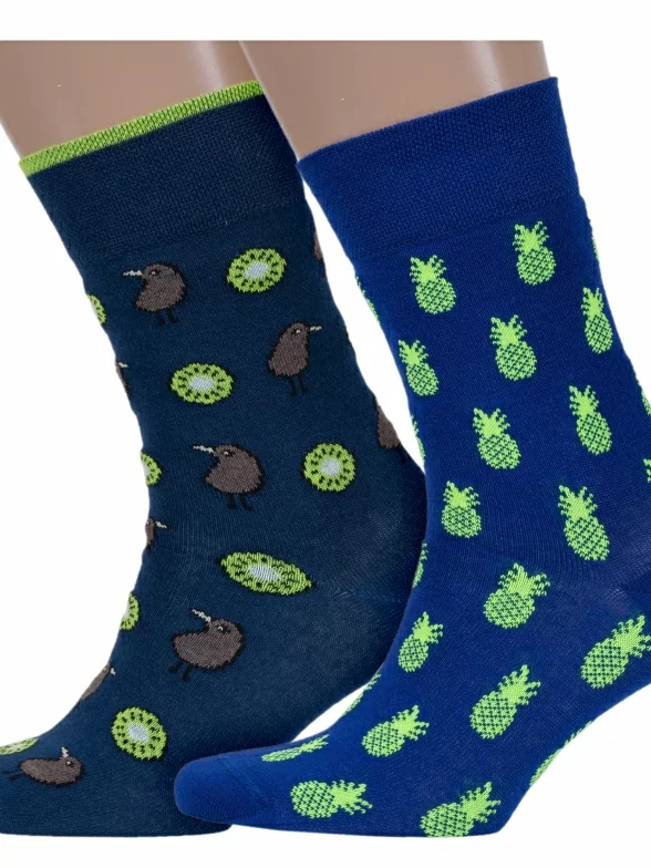 Комплект мужских носков: темно-синяя пара с принтом в виде киви и синяя - с ананасами.