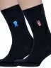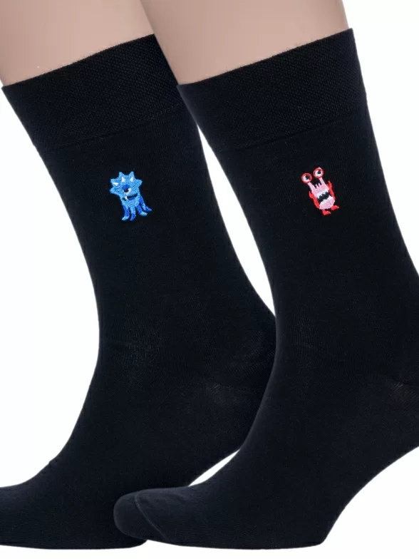 Модель средней длины с двойным бортом (манжетом резинки) и неощутимым швом на мыске; на паголенке объемная вышивка в виде маленького монстра, на стопе вывязан логотип бренда. Изготовлены на фабрике в Беларуси из 70% хлопка с добавлением 28% полиамида и 2% эластана для износостойкости изделия и комфортной посадки.