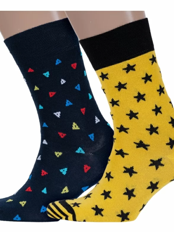 Комплект мужских носков: темно-синяя пара с принтом в виде разноцветных треугольников и желтая - со звездами.