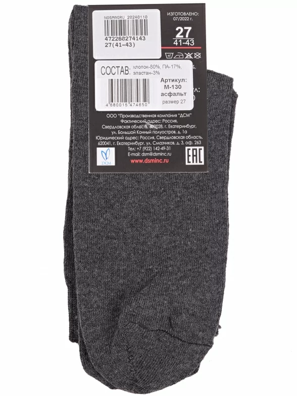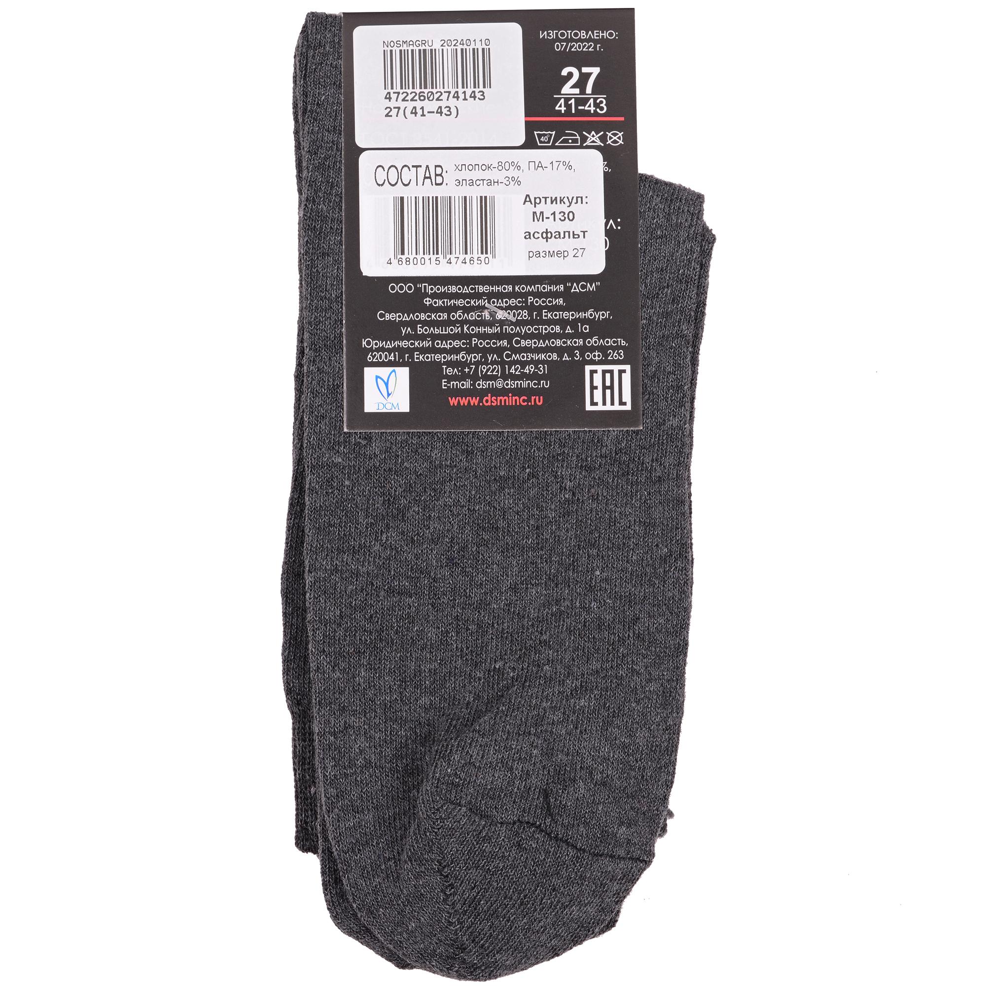 Комплект мужских носков из 2 пар, круглогодичные, укороченные, цвет асфальт, классические, шов обычный (не бесшовные), принт (рисунок): без рисунков/узоров, однотонный, состав: 80% хлопок, 17% полиамид, 3% эластан (лайкра), арт. 2-М-130. Производитель «ООО Производственная компания "ДСМ", Россия» под брендом «Grand line».
