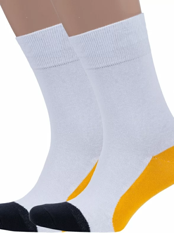 Комплект мужских носков из 2 пар, круглогодичные, средней длины, цвет белый с желтым, повседневные, шов обычный (не бесшовные), принт (рисунок): контрастные пятка / мысок / резинка, состав: 82% хлопок, 15% полиамид, 3% эластан, арт. 2-nm-532. Производитель «ИП Рыбалкин В.С., Московская область, г. Щелково» под брендом «Msclub».