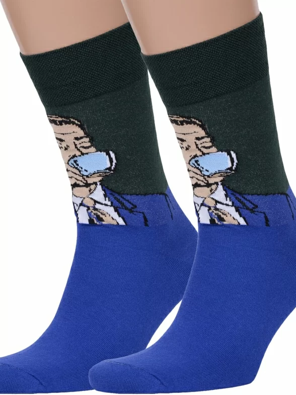 Комплект мужских носков из 2 пар, круглогодичные, средней длины, цвет сине-зеленый, повседневные, шов обычный (не бесшовные), принт (рисунок): фильмы / сериалы / мультики, люди, крупные контрастные рисунки, состав: 82% хлопок, 15% полиамид, 3% эластан, арт. 2-nm-398. Производитель «ИП Рыбалкин В.С., Московская область, г. Щелково» под брендом «Msclub».