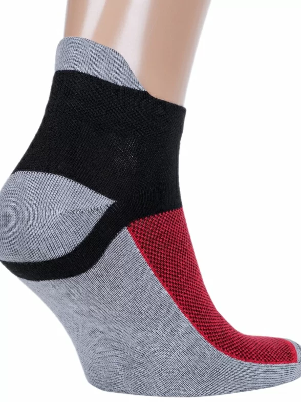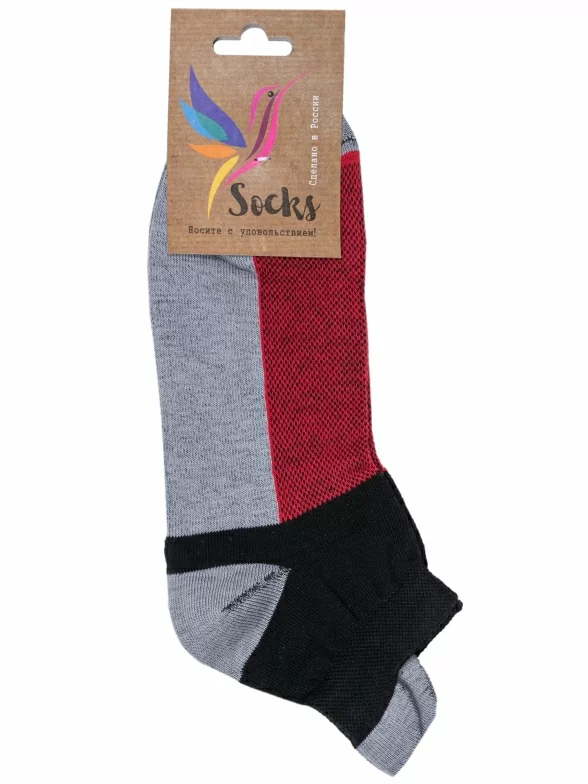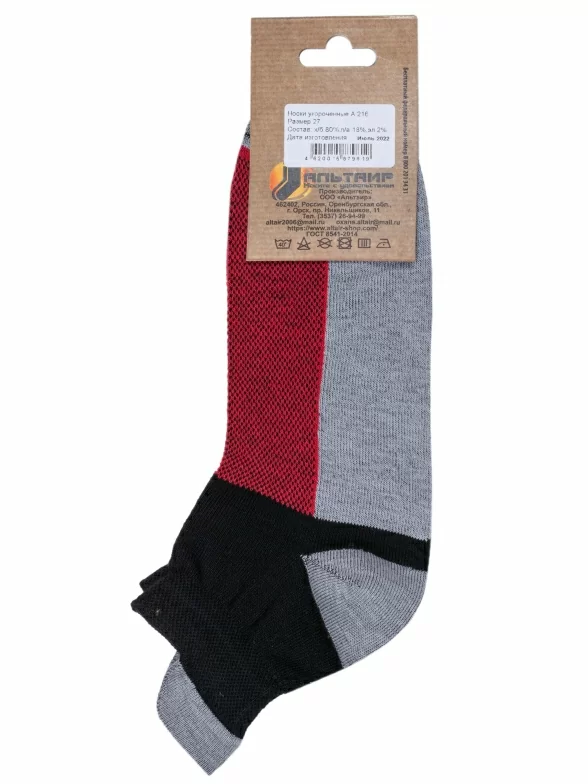 Комплект носков унисекс из 2 пар, круглогодичные, короткие, цвет серо-красный, спортивные, в сеточку, шов обычный (не бесшовные), принт (рисунок): спортивные, с узором, состав: 80% хлопок, 18% полиамид, 2% эластан, арт. 2-А216. Производитель «ООО Альтаир, г. Орск, Оренбургская обл, Россия» под брендом «Альтаир».