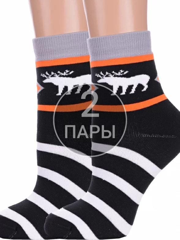 Комплект женских носков из 2 пар, межсезонные или зимние, укороченные, цвет черный, теплые, повседневные, махровые, возможно бесшовные, принт (рисунок): полоски, новый год, контрастные пятка / мысок / резинка, животные, с узором, состав: 88% хлопок, 10% полиамид, 2% эластан, арт. 2-GZ-3R17. Производитель «ХОХ» Россия под брендом «Хох».