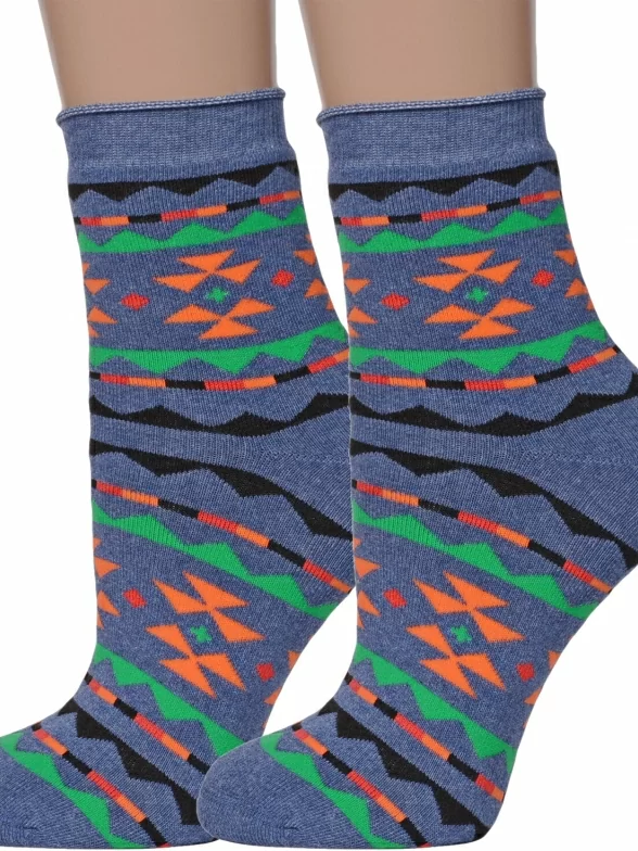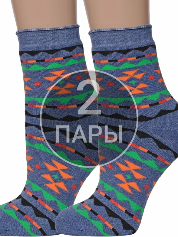Комплект женских носков из 2 пар, межсезонные или зимние, укороченные, цвет джинс, теплые, повседневные, махровые, возможно бесшовные, принт (рисунок): орнамент, норвежский жаккард, с узором, крупные контрастные рисунки, состав: 80% хлопок, 18% полиамид, 2% эластан, арт. 2-GZ-3R24. Производитель «ХОХ» Россия под брендом «Хох».