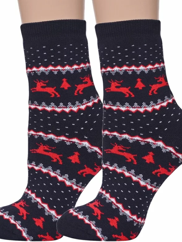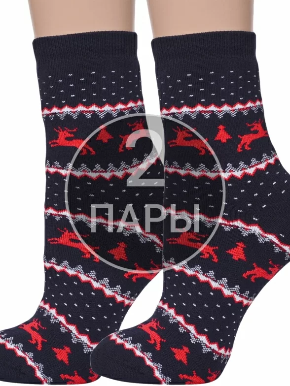 Комплект женских носков из 2 пар, межсезонные или зимние, укороченные, цвет темно-синие, теплые, повседневные, махровые, возможно бесшовные, принт (рисунок): орнамент, норвежский жаккард, животные, с узором, крупные контрастные рисунки, состав: 80% хлопок, 18% полиамид, 2% эластан, арт. 2-GZ-3R14. Производитель «ХОХ» Россия под брендом «Хох».