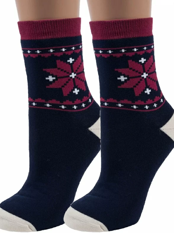 Комплект женских носков из 2 пар, межсезонные или зимние, укороченные, цвет темно-синие, теплые, повседневные, махровые, возможно бесшовные, принт (рисунок): орнамент, норвежский жаккард, с узором, состав: 80% хлопок, 18% полиамид, 2% эластан, арт. 2-GZ-3R15. Производитель «ХОХ» Россия под брендом «Хох».