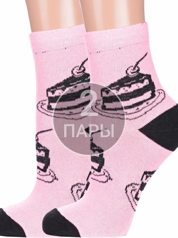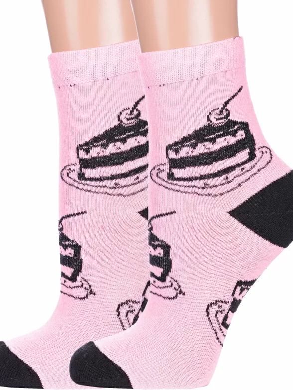 Комплект женских носков из 2 пар, круглогодичные, укороченные, цвет розово-черный, повседневные, шов обычный (не бесшовные), принт (рисунок): контрастные пятка / мысок / резинка, еда и напитки, с узором, состав: 78% хлопок, 20% полиамид, 2% эластан, арт. 2-А215. Производитель «ООО Альтаир, г. Орск, Оренбургская обл, Россия» под брендом «Альтаир».