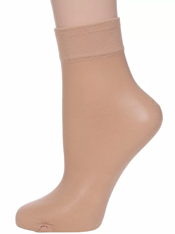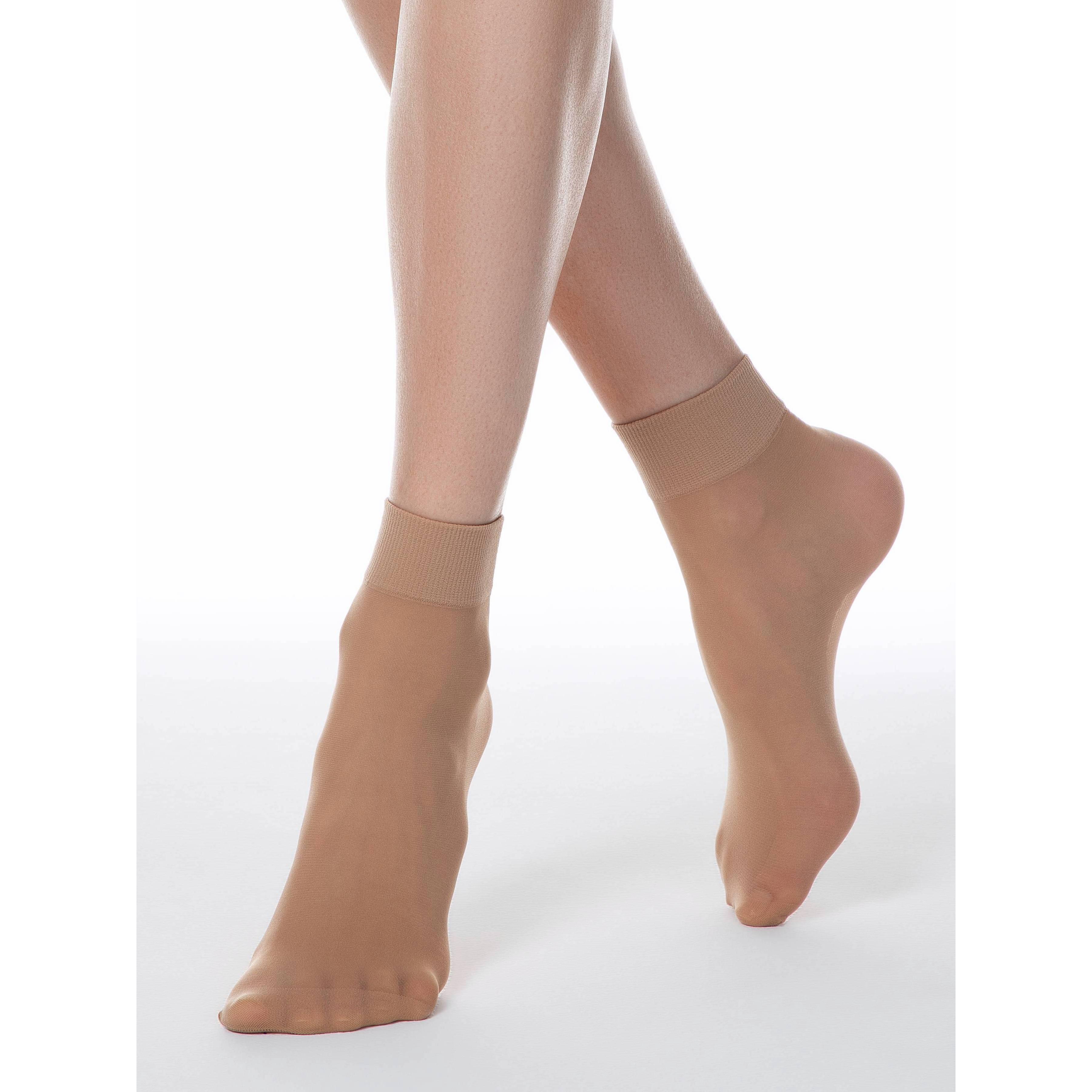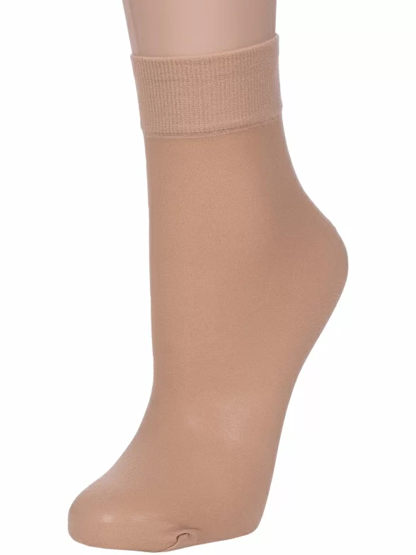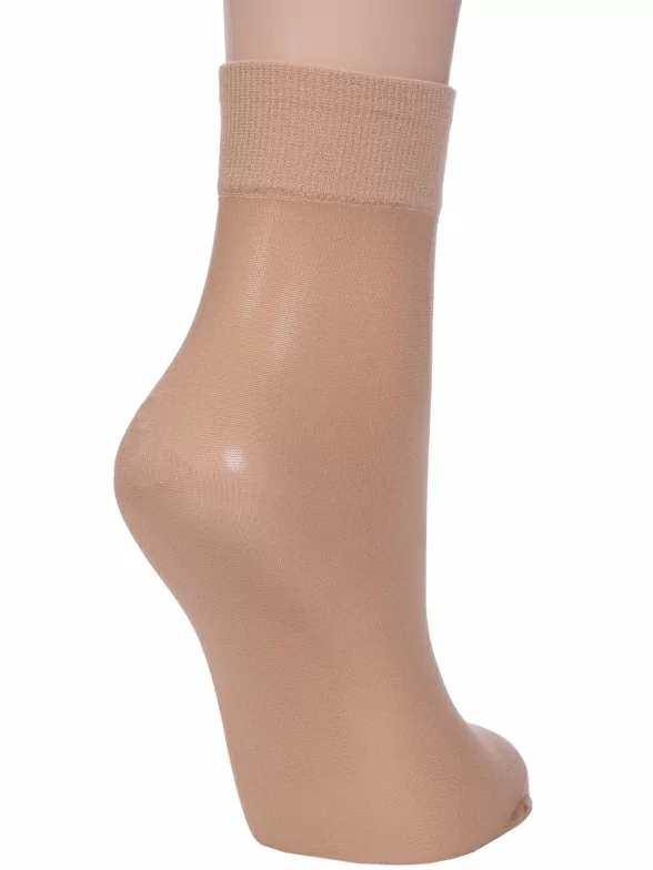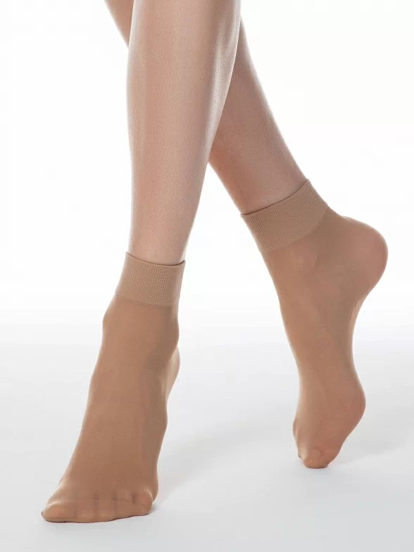 Укороченная модель плотностью 40 den без отдельно вывязанной пятки, с широким и уплотненным двойным бортом (манжетом резинки) и обычным швом на укрепленном мыске. Изготовлены в Беларуси из гладкого синтетического полотна на основе 83% полиамида с добавлением 17% эластана, благодаря чему изделие износостойкое и хорошо тянется.