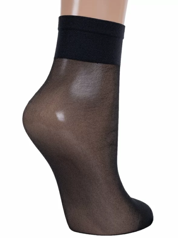 Изготовлены на фабрике в Беларуси из полиамида с добавлением эластана для комфортной посадки. Укороченная модель без вывязанной пятки плотностью 20 den с двойным бортом (манжетом резинки) и обычным швом на уплотненном мыске.