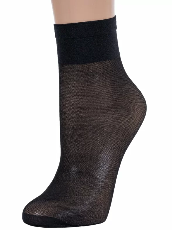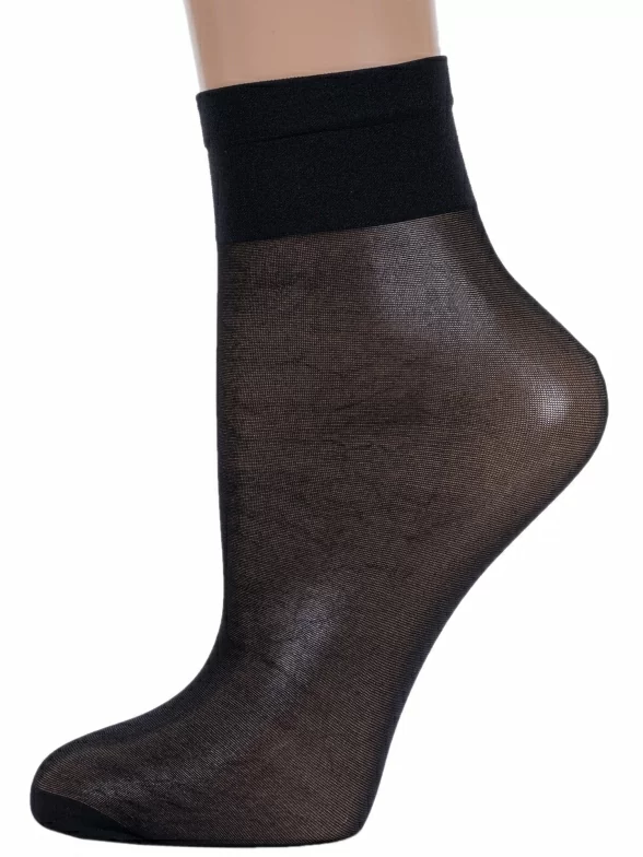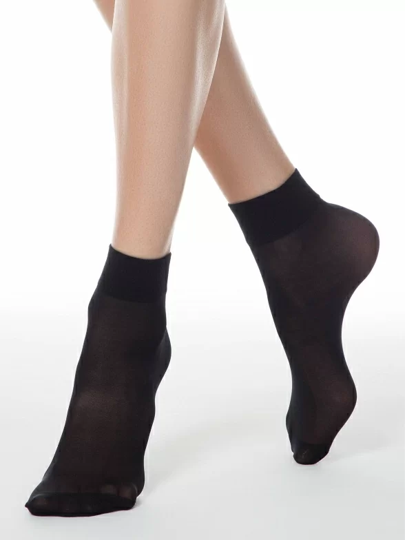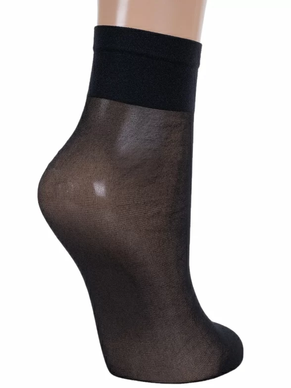 Изготовлены на фабрике в Беларуси из полиамида с добавлением эластана для комфортной посадки. Укороченная модель без вывязанной пятки плотностью 40 den с двойным бортом (манжетом резинки) и обычным швом на уплотненном мыске.