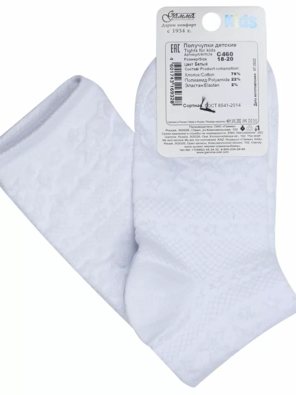 В комплект входят 3 пары белых гольфов артикула С460 с индивидуальными фабричными этикетками.