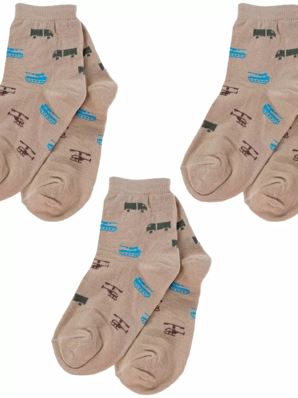 Комплект детских носков бренда Альтаир с принтом в виде военной техники. Подойдут мальчикам для прогулок, школы или детского сада в демисезонный период.