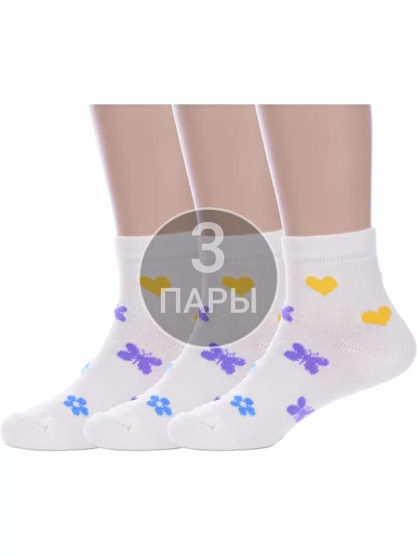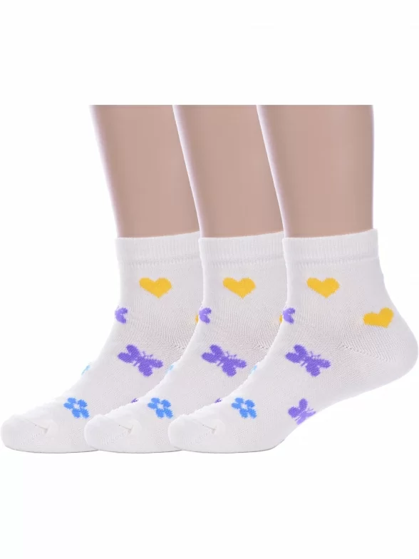 Комплект детских носков из 3 пар, круглогодичные, укороченные, цвет экрю, повседневные, шов обычный (не бесшовные), принт (рисунок): сердечки / поцелуи / любовь, бабочки / бантики, состав: 80% хлопок, 18% полиамид, 2% эластан, арт. 3-А37. Производитель «ООО Альтаир, г. Орск, Оренбургская обл, Россия» под брендом «Альтаир».