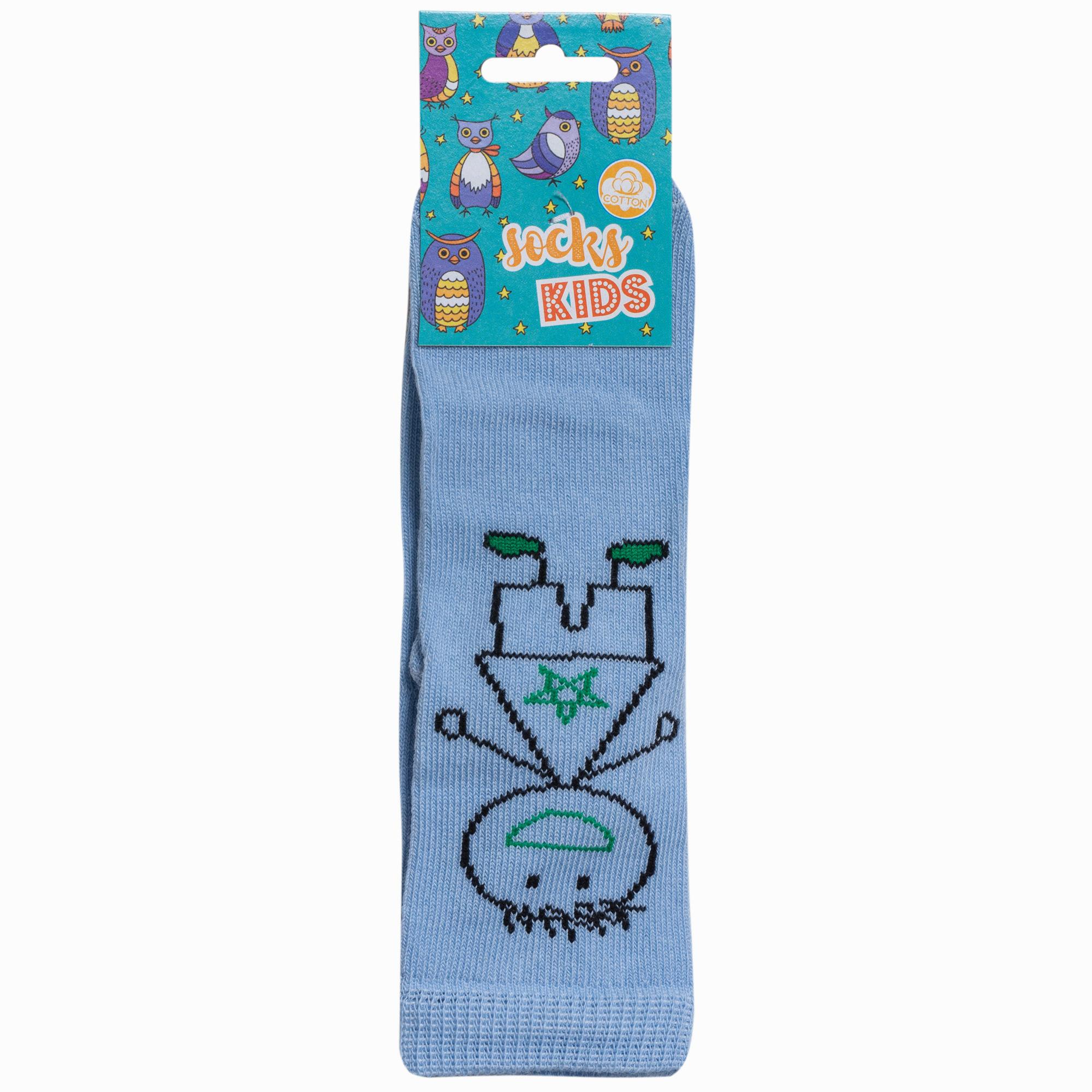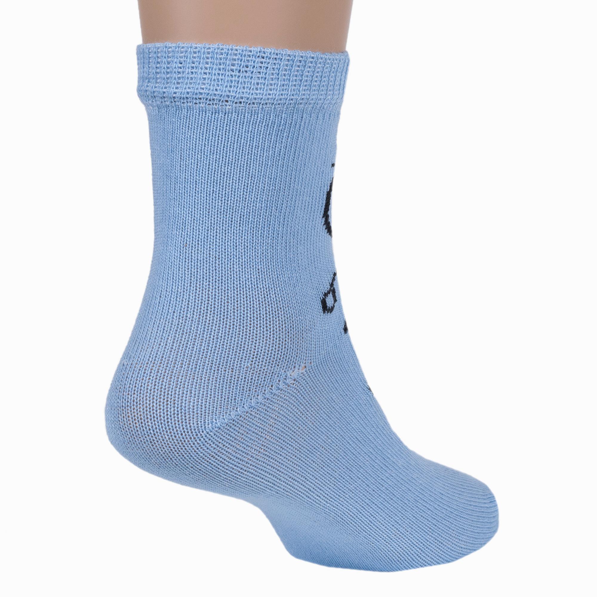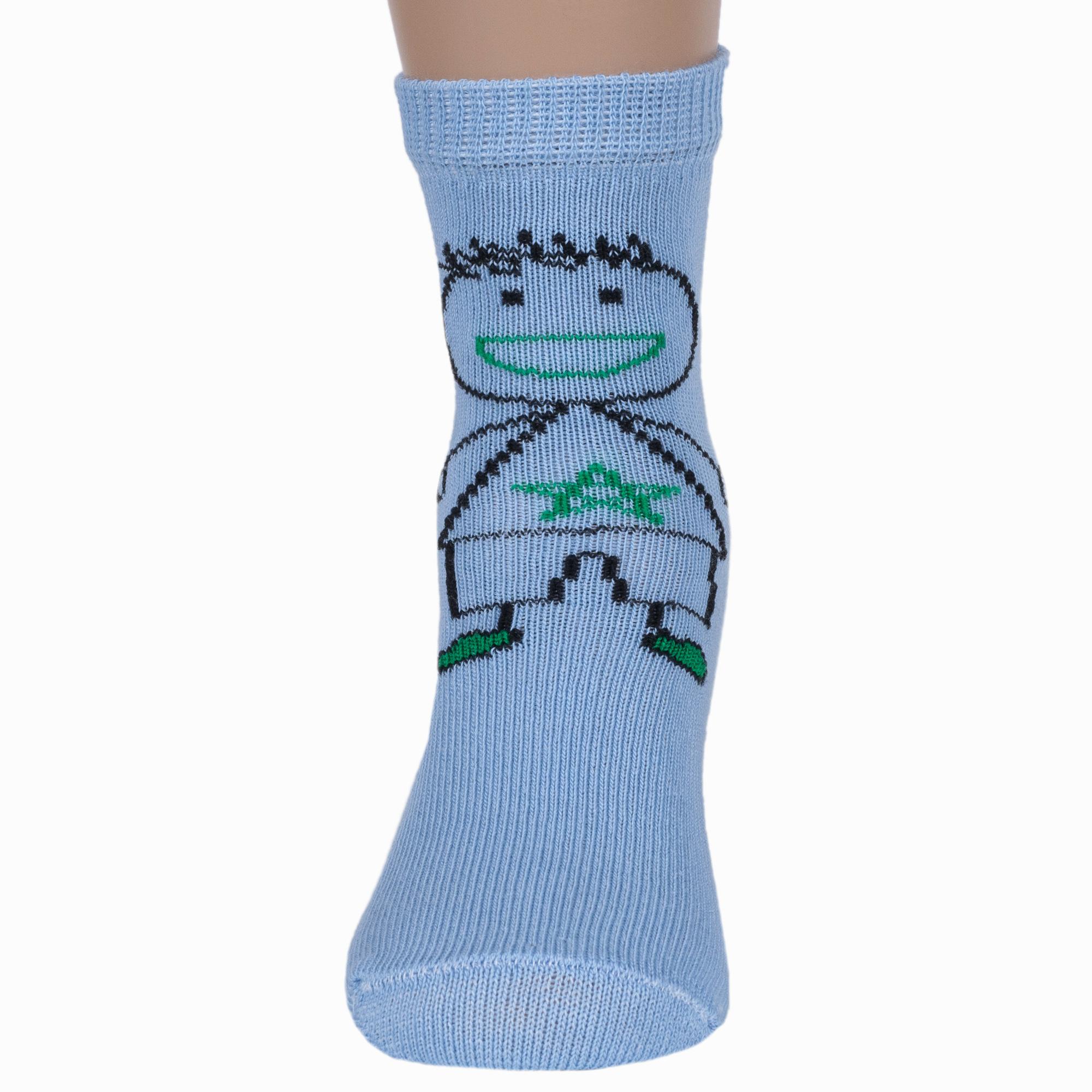 Изготовлены на российской фабрике в г. Орске из хлопка с добавлением полиамида и эластана для повышенной износостойкости изделия и комфортной посадки. Укороченная модель голубого цвета с рисунком мальчика, с двойным бортом (манжетом резинки) и обычным швом на мыске.