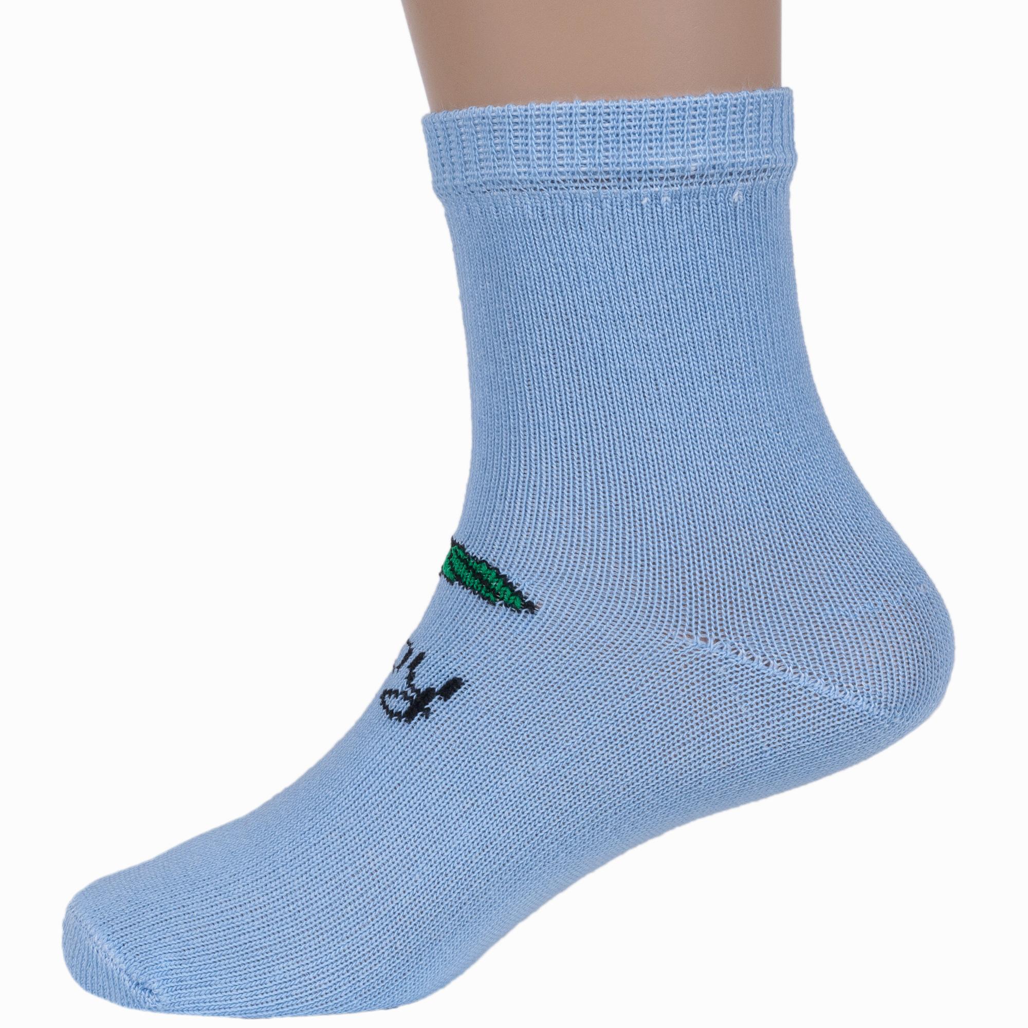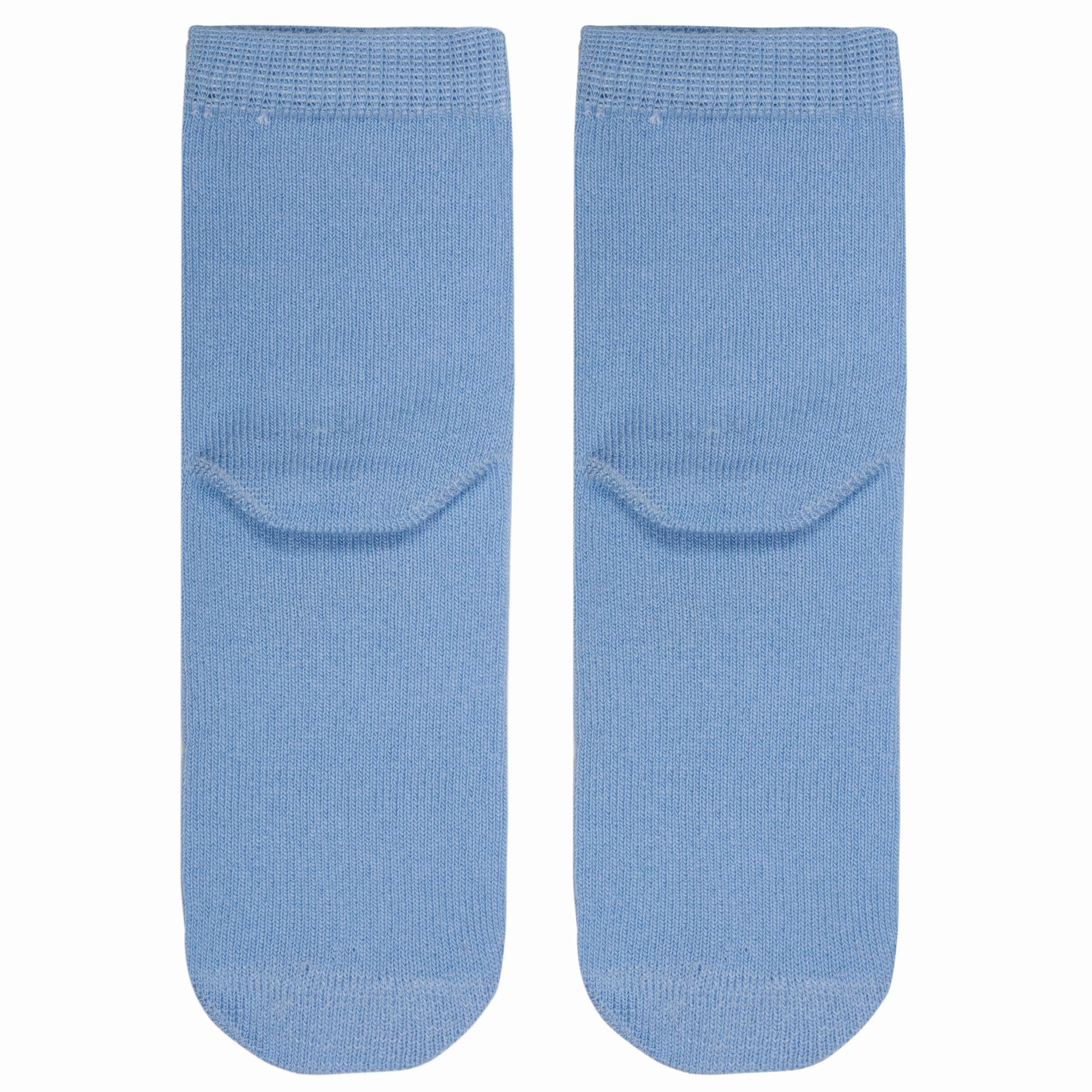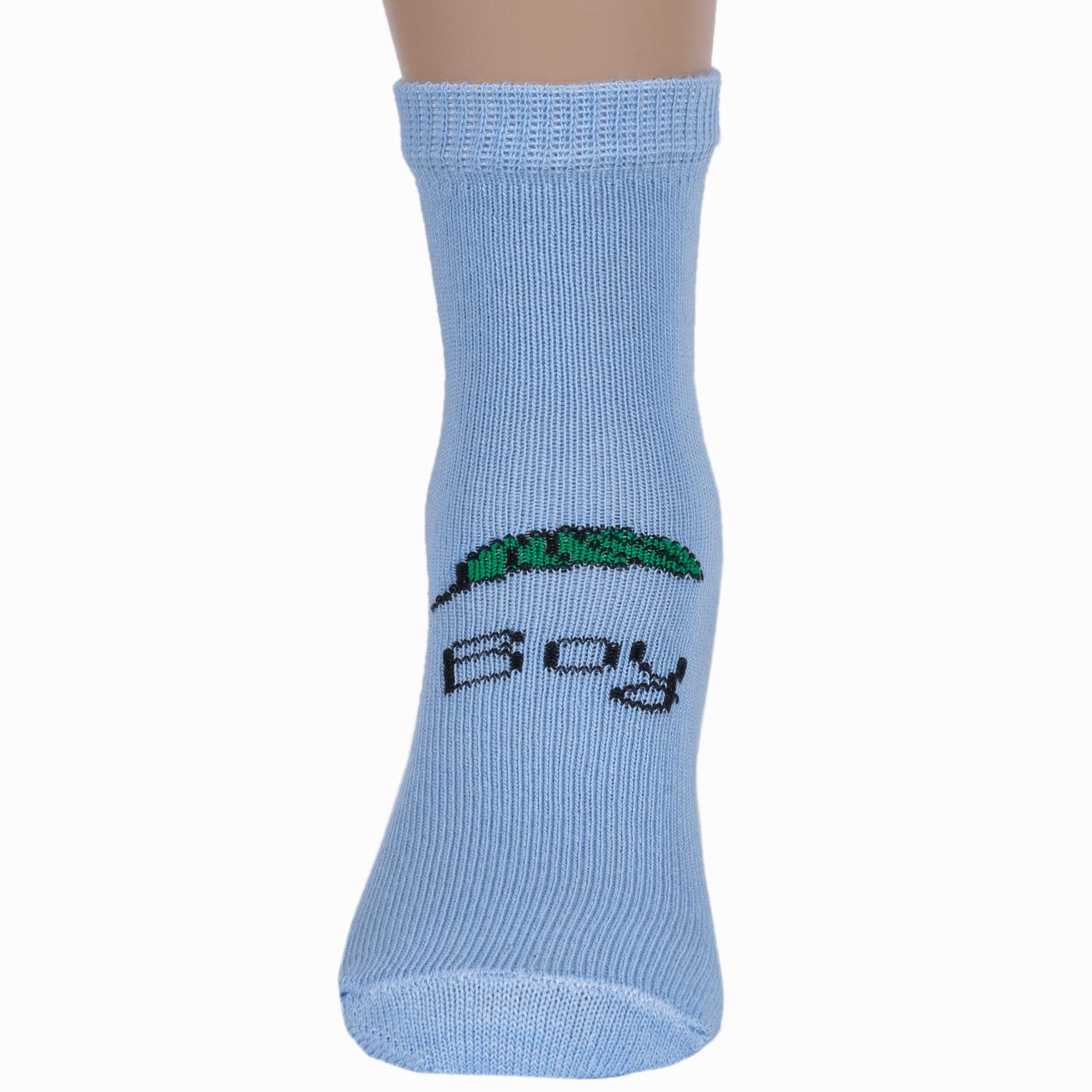 Изготовлены на российской фабрике в г. Орске из хлопка с добавлением полиамида и эластана для повышенной износостойкости изделия и комфортной посадки. Укороченная модель голубого цвета с рисунком мальчика, с двойным бортом (манжетом резинки) и обычным швом на мыске.