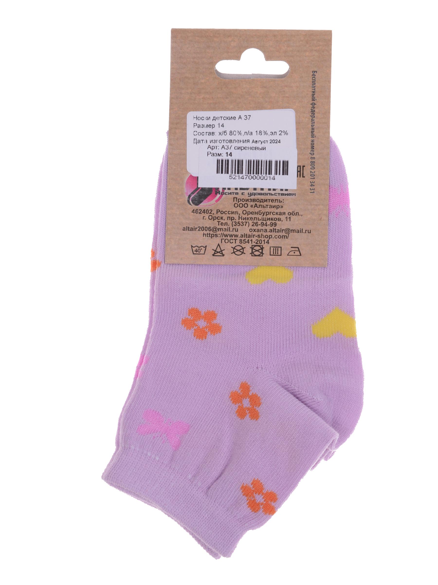 Комплект детских носков из 3 пар, круглогодичные, укороченные, цвет сиреневый, повседневные, шов обычный (не бесшовные), принт (рисунок): бабочки / бантики, сердечки / поцелуи / любовь, состав: 80% хлопок, 18% полиамид, 2% эластан, арт. 3-А37. Производитель «ООО Альтаир, г. Орск, Оренбургская обл, Россия» под брендом «Альтаир».