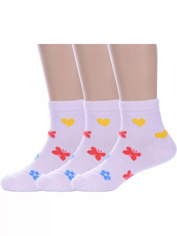Комплект детских носков из 3 пар, круглогодичные, укороченные, цвет светло-сиреневый, повседневные, шов обычный (не бесшовные), принт (рисунок): бабочки / бантики, сердечки / поцелуи / любовь, состав: 80% хлопок, 18% полиамид, 2% эластан, арт. 3-А37. Производитель «ООО Альтаир, г. Орск, Оренбургская обл, Россия» под брендом «Альтаир».