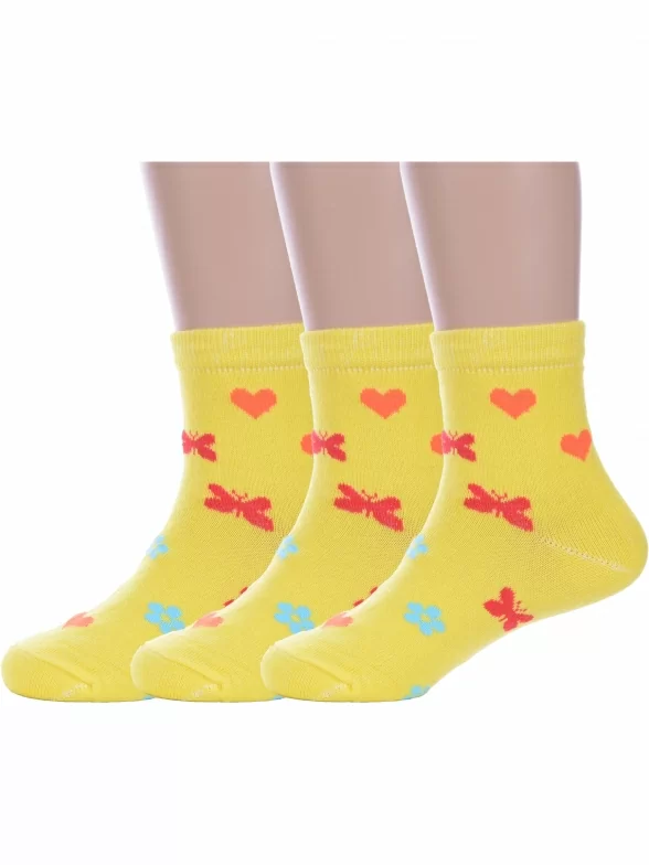 Комплект детских носков из 3 пар, круглогодичные, укороченные, цвет желтый, повседневные, шов обычный (не бесшовные), принт (рисунок): сердечки / поцелуи / любовь, бабочки / бантики, состав: 80% хлопок, 18% полиамид, 2% эластан, арт. 3-А37. Производитель «ООО Альтаир, г. Орск, Оренбургская обл, Россия» под брендом «Альтаир».