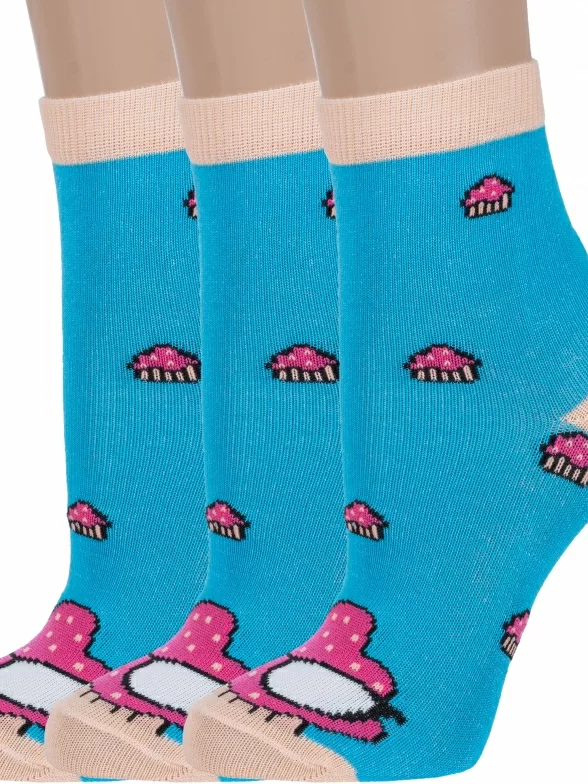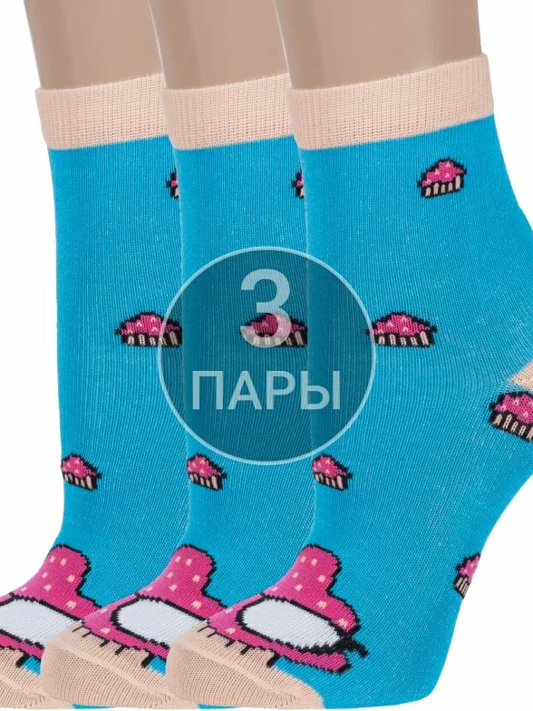 Комплект детских носков из 3 пар, круглогодичные, укороченные, цвет бирюзовый, прикольные, состав: 71% хлопок, 26% полиэстер, 3% эластан, фабричный артикул 3-8СД1003/1. Производитель «АО Борисоглебский трикотаж, Воронежская обл, Россия» под брендом «Борисоглебский трикотаж».