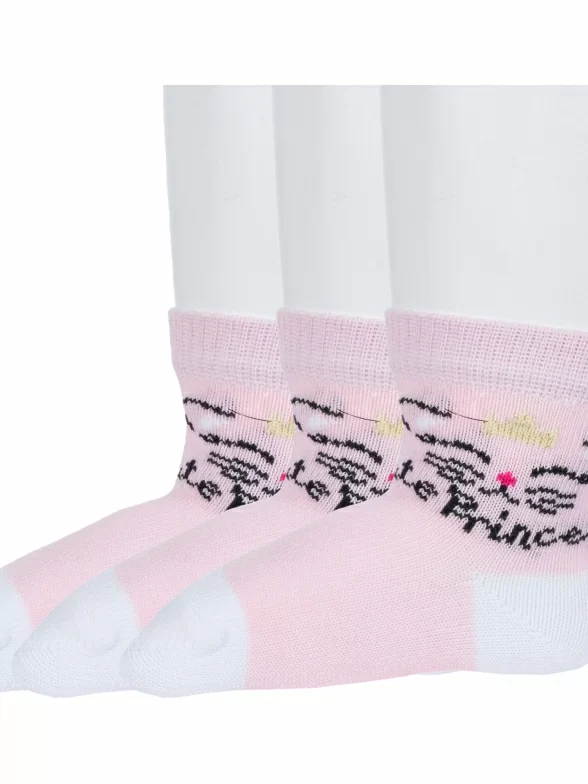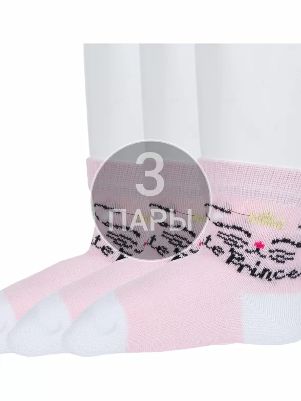 Комплект детских носков из 3 пар, круглогодичные, укороченные, цвет розовый, с принтом, состав: 76% хлопок, 21% полиэстер, 3% эластан, арт. 3-8СД1005. Производитель «АО Борисоглебский трикотаж, Воронежская обл, Россия» под брендом «Борисоглебский трикотаж».