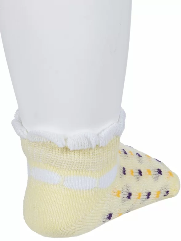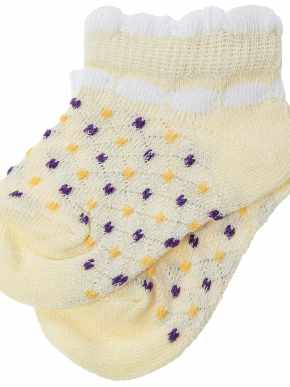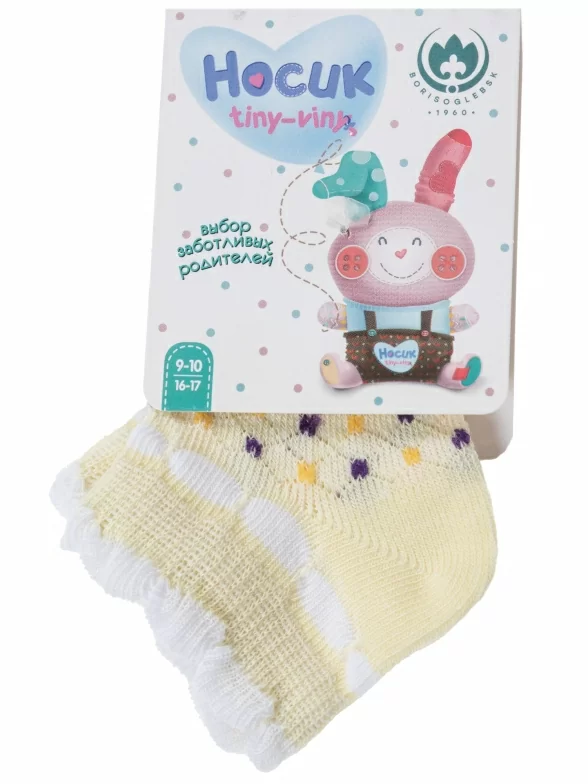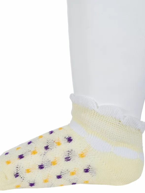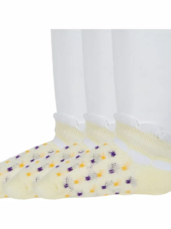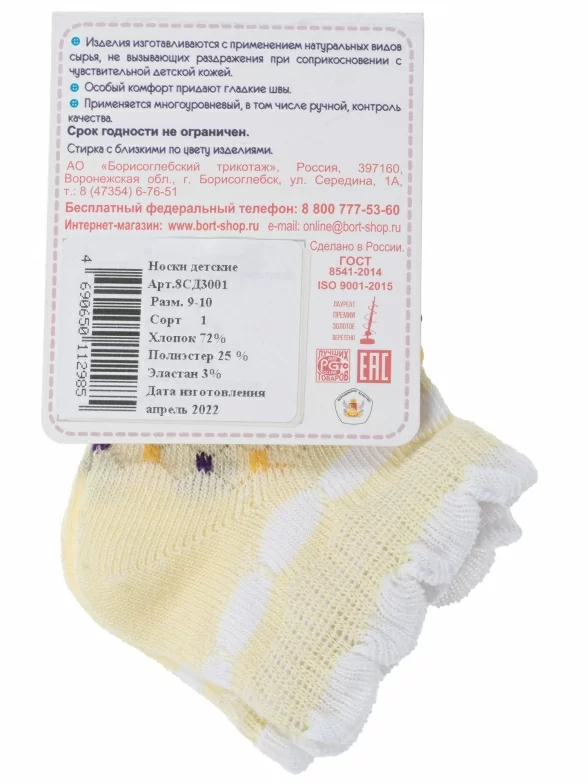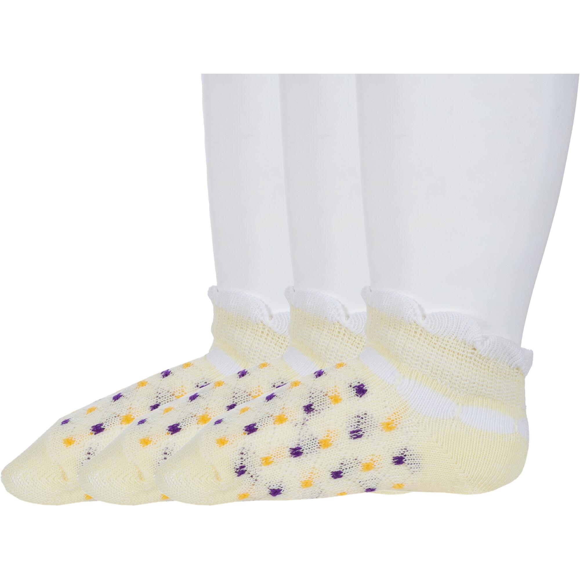 Комплект детских носков из 3 пар, летние, короткие, цвет желтый, ажурные, состав: 72% хлопок, 25% полиэстер, 3% эластан, фабричный артикул 3-8СД3001. Производитель «АО Борисоглебский трикотаж, Воронежская обл, Россия» под брендом «Борисоглебский трикотаж».