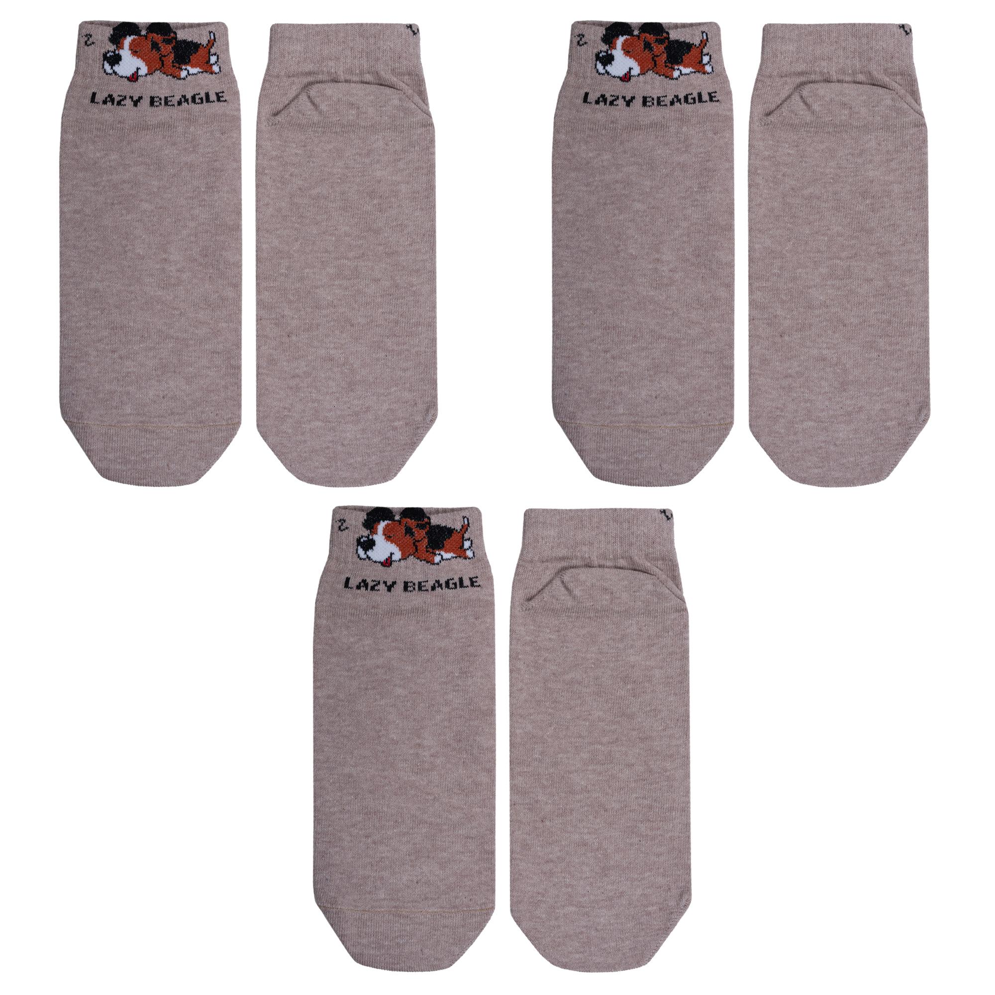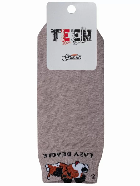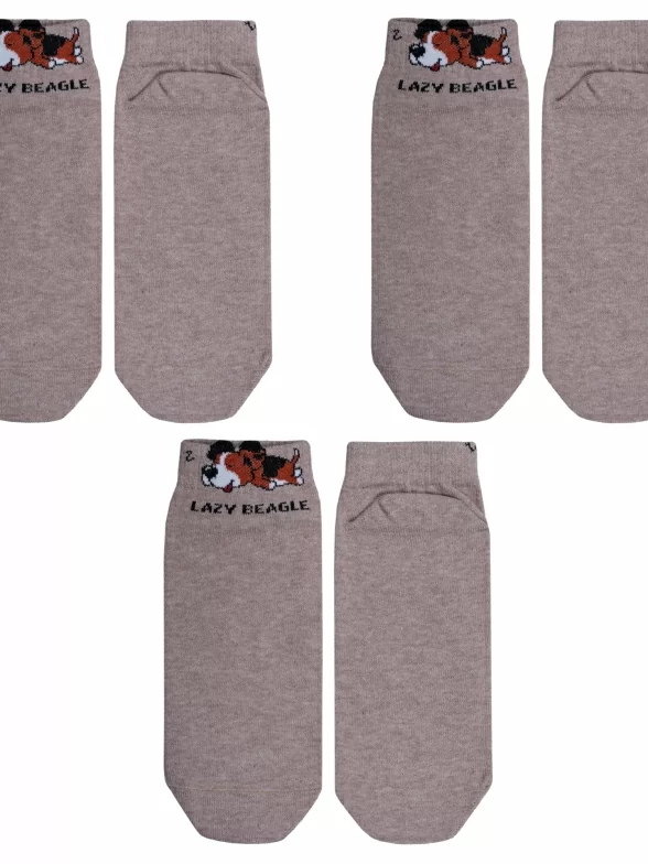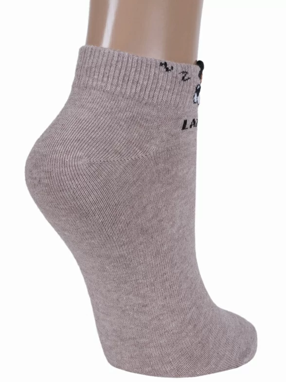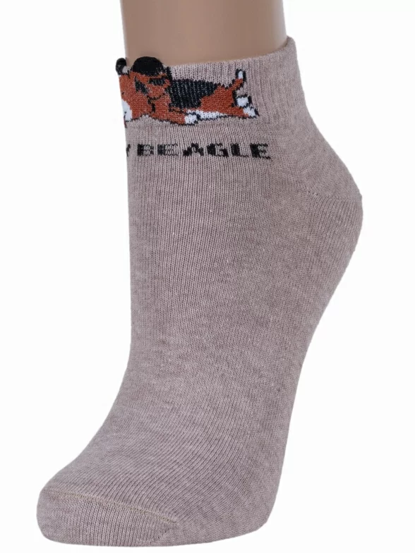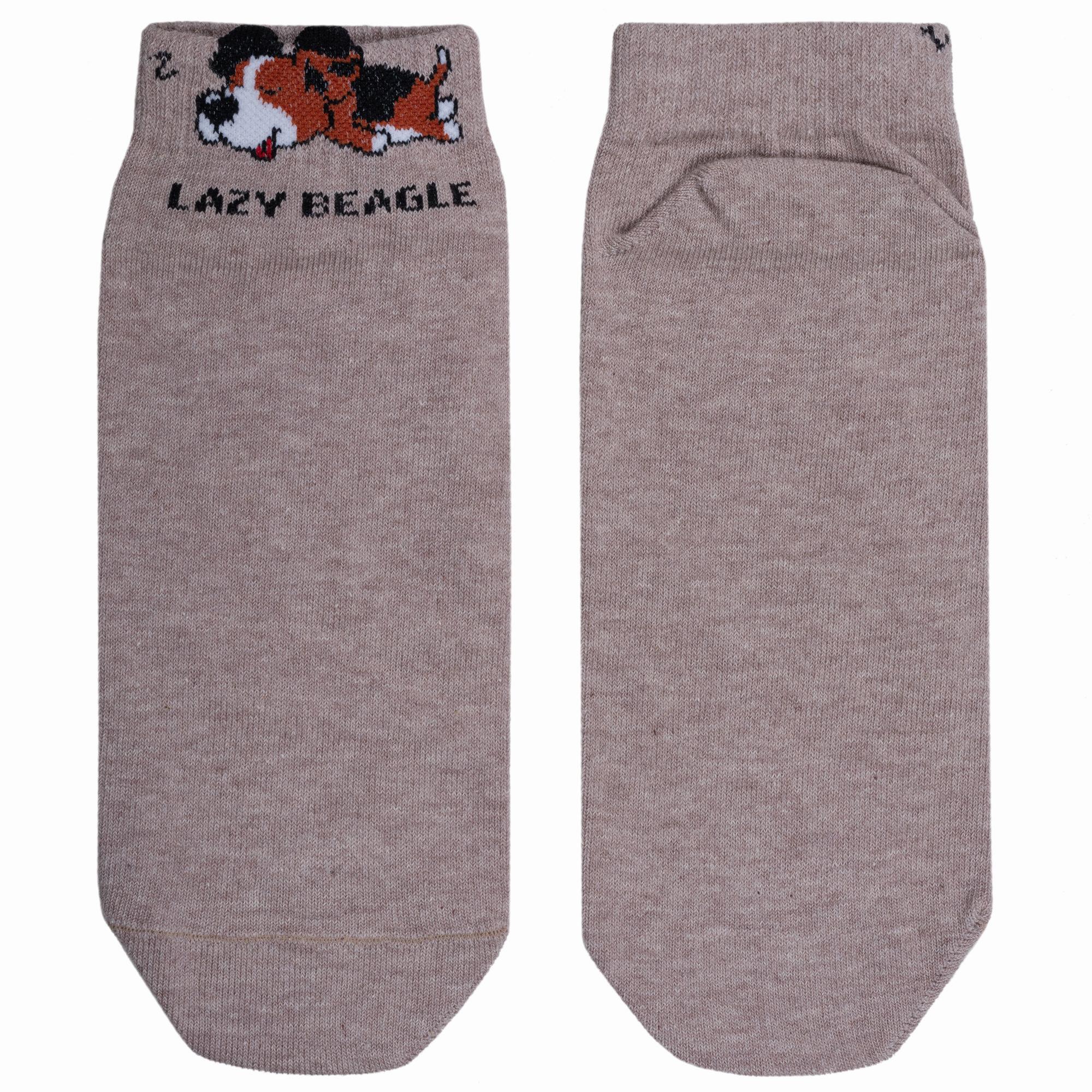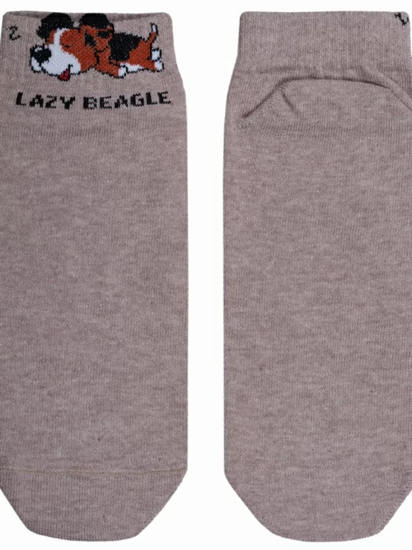 Короткая модель цвета бежевый меланж с двойным бортом (манжетом резинки); украшена изображением собачки и надписью на английском языке "Ленивый бигль". Изготовлены в г. Орле из хлопка с добавлением полиамида и эластана для износостойкости изделия и комфортной посадки.