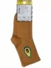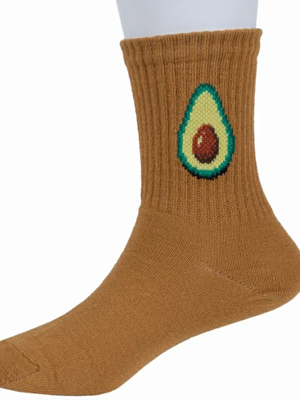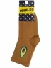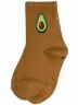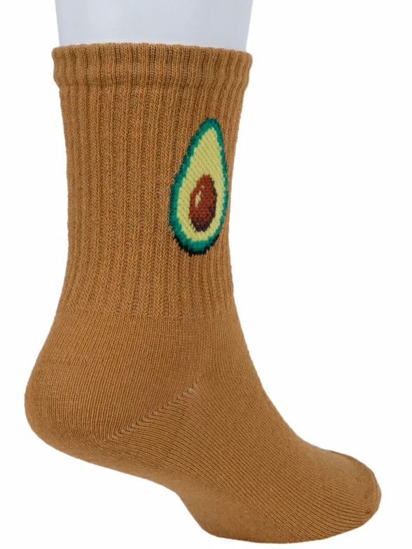 Модель средней длины горчичного цвета с двойным бортом (манжетом резинки); украшена принтом в виде авокадо. Изготовлены в г. Орле из хлопка с добавлением полиамида и эластана для износостойкости изделия и комфортной посадки. В состав также входит полипропилен, благодаря которому носки хорошо отводят влагу с поверхности кожи и быстро сохнут.