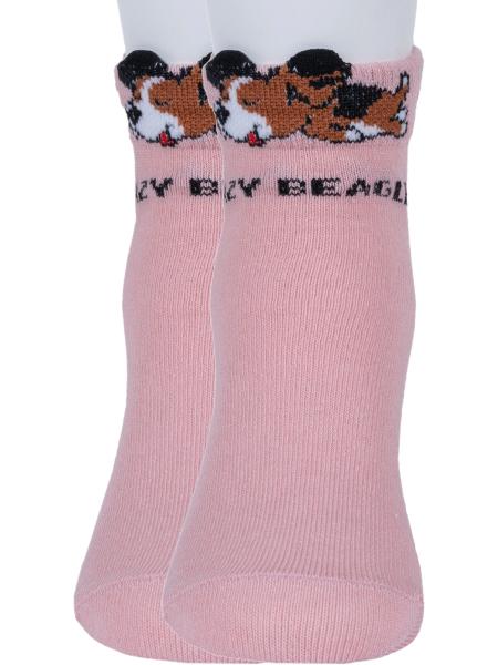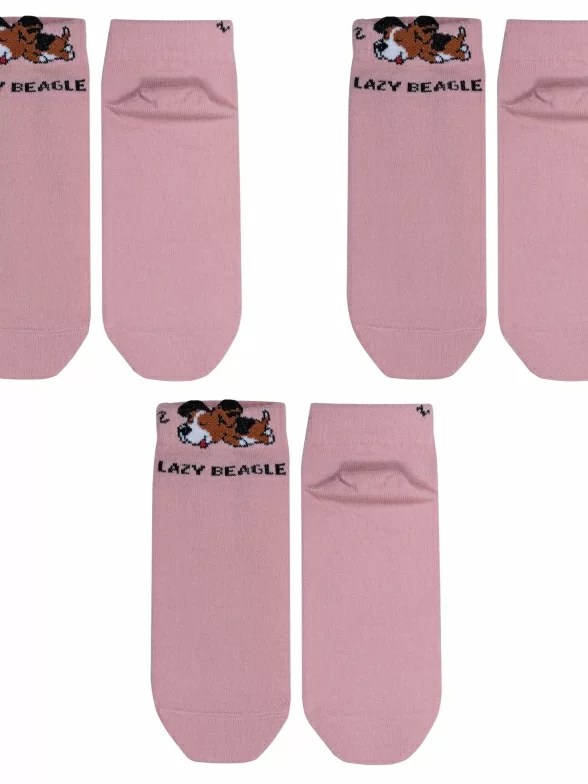 Короткая модель цвета пыльной розы с двойным бортом (манжетом резинки); украшена изображением собачки и надписью на английском языке "Ленивый бигль". Изготовлены в г. Орле из хлопка с добавлением полиамида и эластана для износостойкости изделия и комфортной посадки.