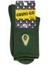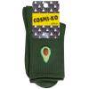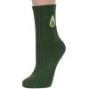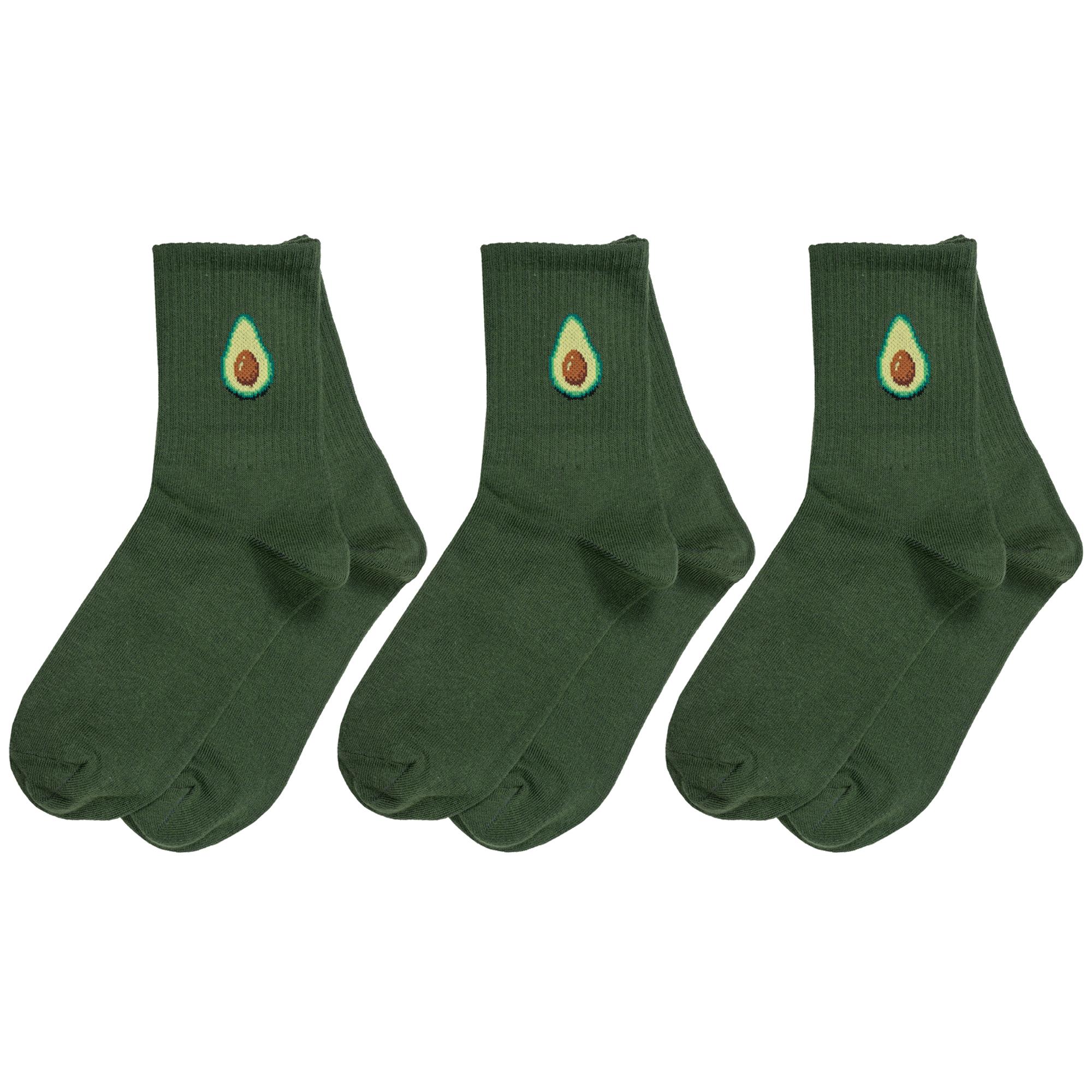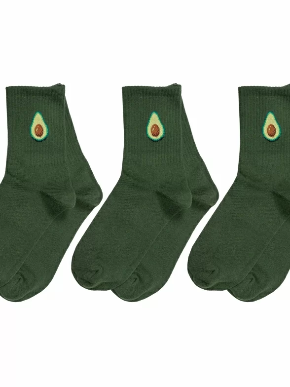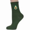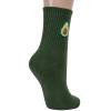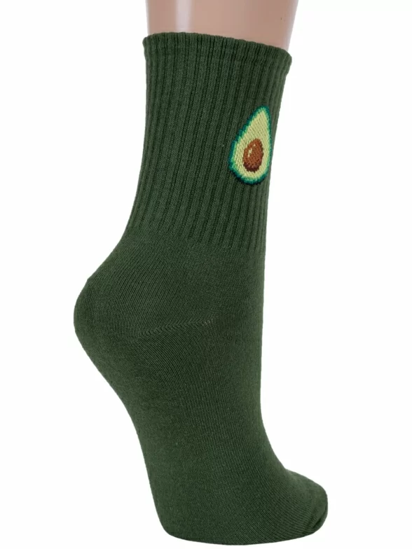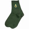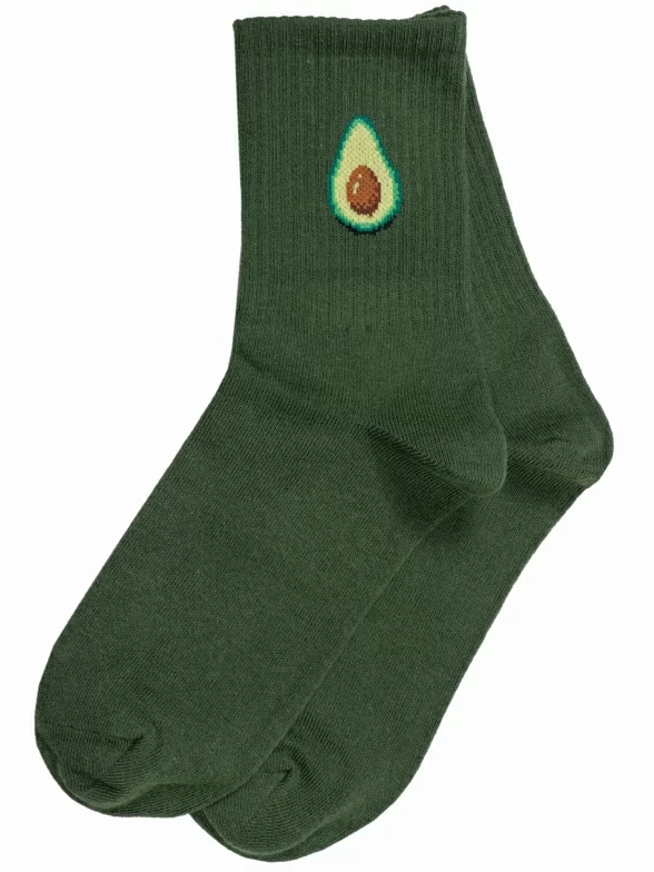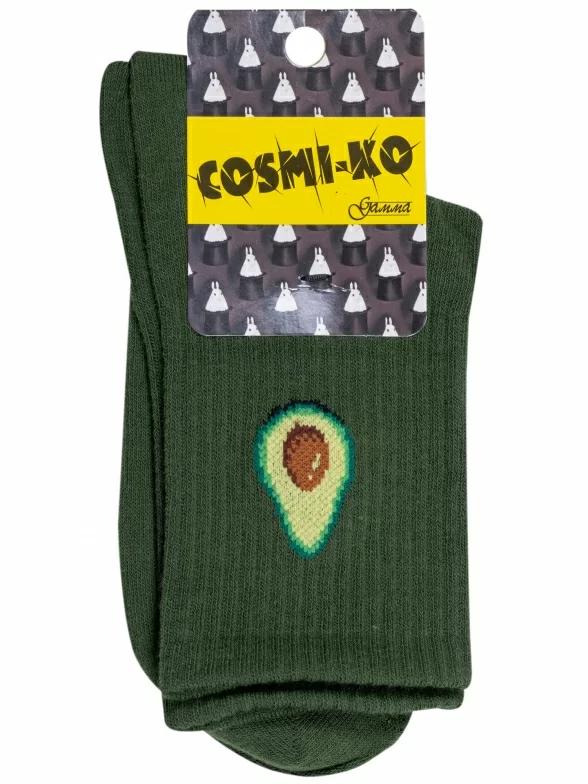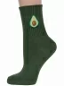 Модель средней длины цвета шотландской зелени с двойным бортом (манжетом резинки); украшена принтом в виде авокадо. Изготовлены в г. Орле из хлопка с добавлением полиамида и эластана для износостойкости изделия и комфортной посадки. В состав также входит полипропилен, благодаря которому носки хорошо отводят влагу с поверхности кожи и быстро сохнут.