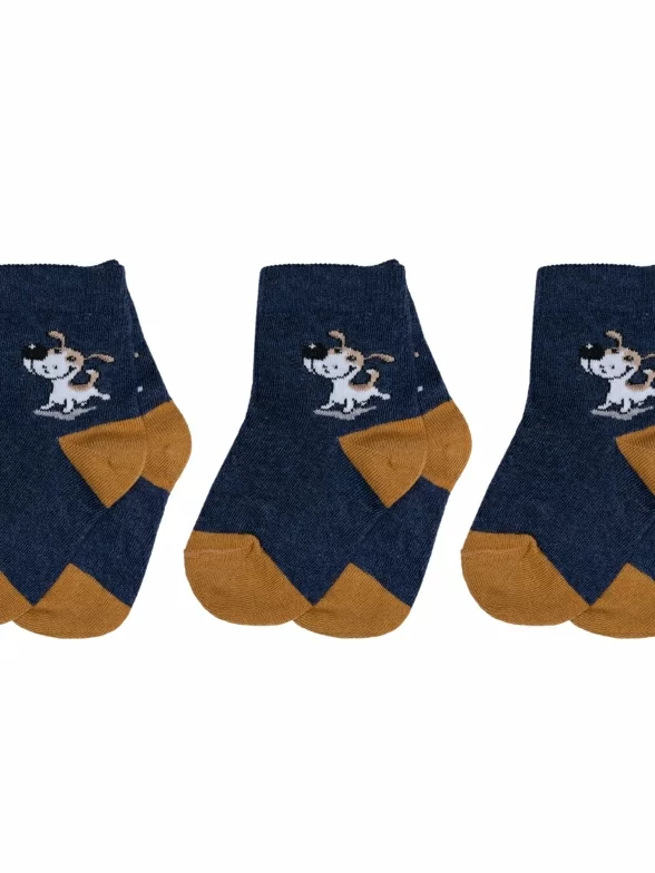 Модель средней длины цвета темно-синий меланж с двойным бортом (манжетом резинки); украшена принтом в виде собачки. Изготовлены в г. Орле из хлопка с добавлением полиамида и эластана для износостойкости изделия и комфортной посадки. В состав также входит полипропилен, благодаря которому носки хорошо отводят влагу с поверхности кожи и быстро сохнут.