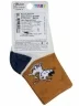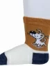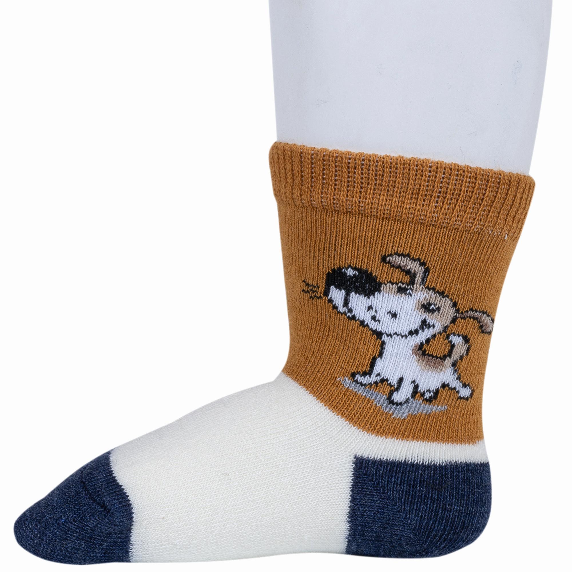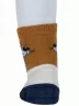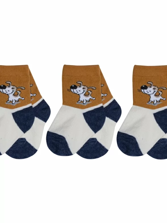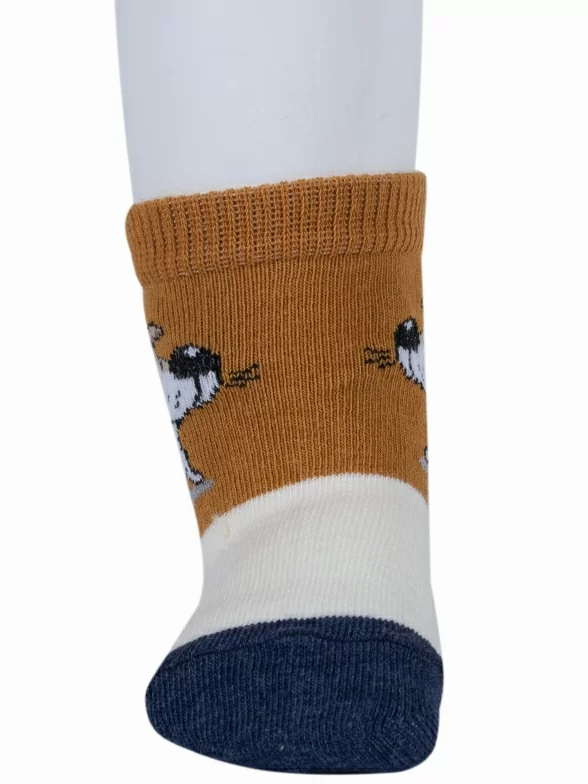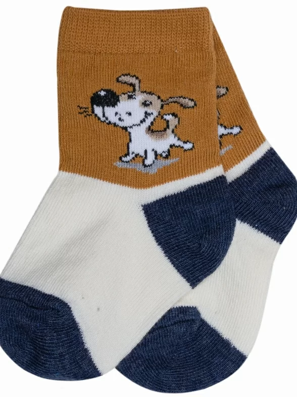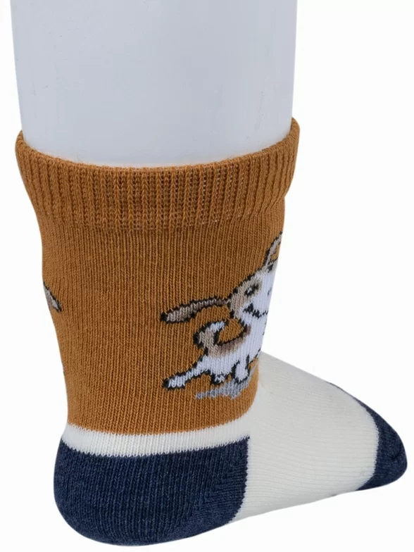 Модель средней длины терракотового цвета с двойным бортом (манжетом резинки); украшена принтом в виде собачки. Изготовлены в г. Орле из хлопка с добавлением полиамида и эластана для износостойкости изделия и комфортной посадки. В состав также входит полипропилен, благодаря которому носки хорошо отводят влагу с поверхности кожи и быстро сохнут.