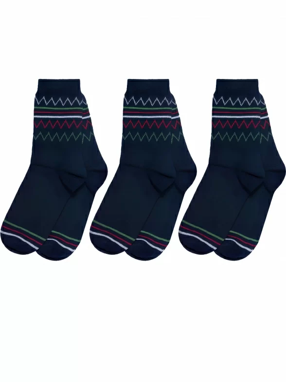 Комплект детских носков из 3 пар, круглогодичные, средней длины, цвет темно-синие, повседневные, классические, шов обычный (не бесшовные), принт (рисунок): полоски, зигзаг / молния, состав: 88% хлопок, 10% полиамид, 2% эластан, арт. 3-D-3R6. Производитель «ХОХ» Россия под брендом «Хох».