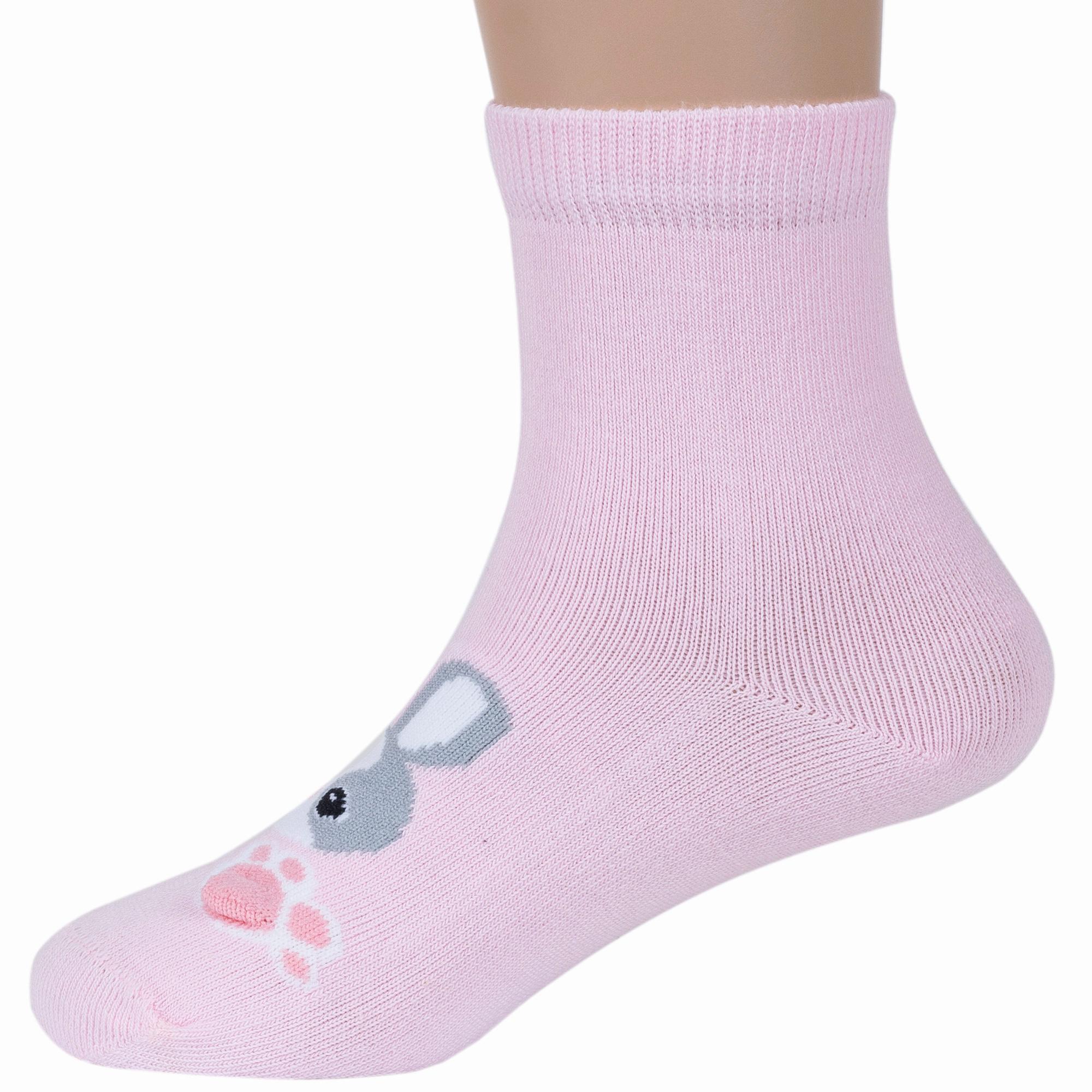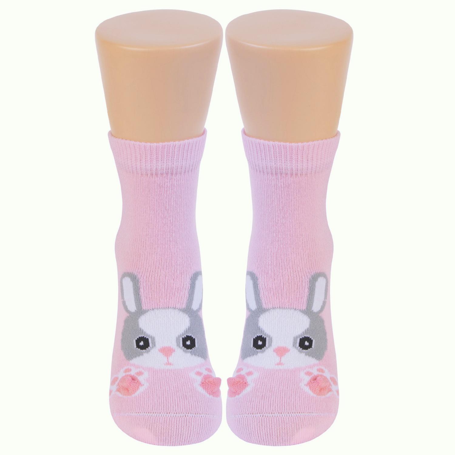 Укороченная модель розового цвета с принтом в виде зайчика и с двойным бортом (манжетом резинки). Изготовлены в г. Иваново из хлопка с добавлением полиамида и эластана для износостойкости изделия и комфортной посадки. В состав также входит полипропилен, благодаря ему носки хорошо отводят влагу с поверхности кожи и быстро сохнут.