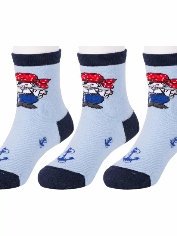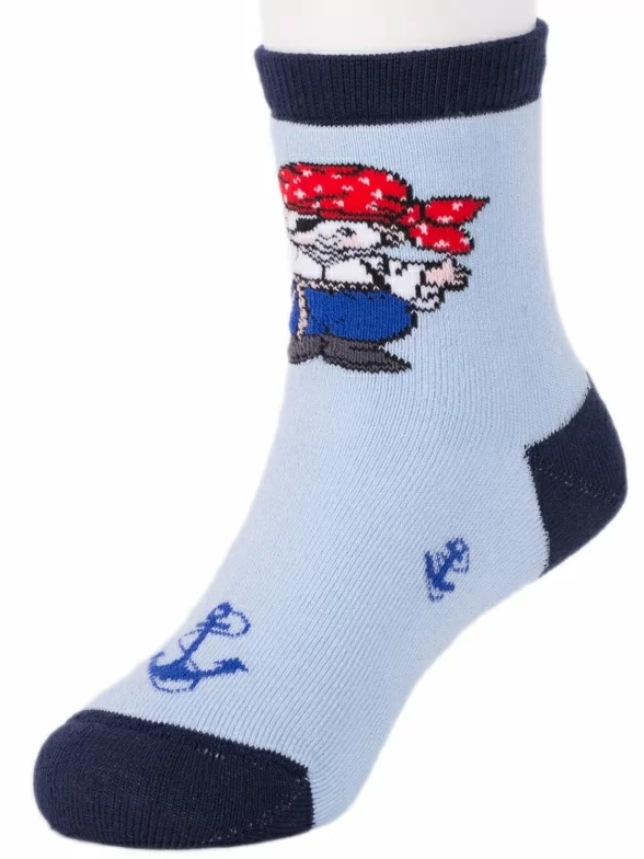 Изготовлены на фабрике в Ставропольском крае из хлопка с добавлением полиамида и эластана для износостойкости изделия и комфортной посадки. Модель средней длины с пиратским принтом; имеет двойной борт (манжет резинки) и обычный шов на мыске.