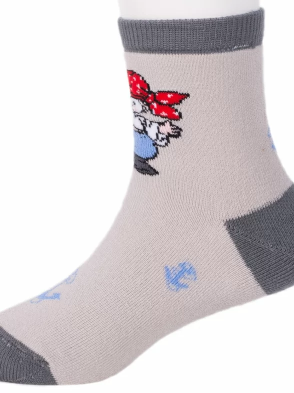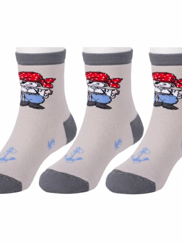Изготовлены на фабрике в Ставропольском крае из хлопка с добавлением полиамида и эластана для износостойкости изделия и комфортной посадки. Модель средней длины с пиратским принтом; имеет двойной борт (манжет резинки) и обычный шов на мыске.