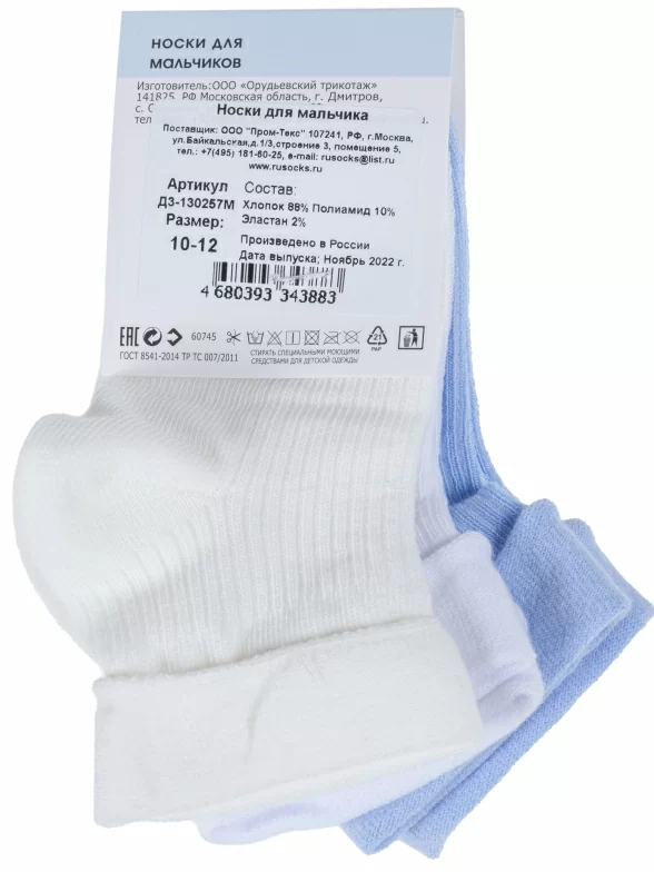 В комплект входят 3 пары носков арт. Д3-130257М: по 1 паре белого, кремового и голубого цветов. Поставляются с единой фабричной этикеткой в обычном или курьер-пакете.