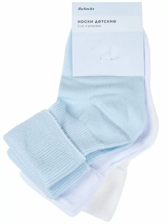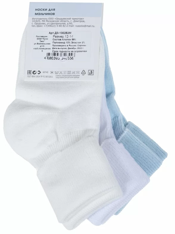 В комплект входят 3 пары носков арт. Д3-130262М: по 1 паре белого, кремового и голубого цветов. Поставляются с единой фабричной этикеткой в обычном или курьер-пакете.