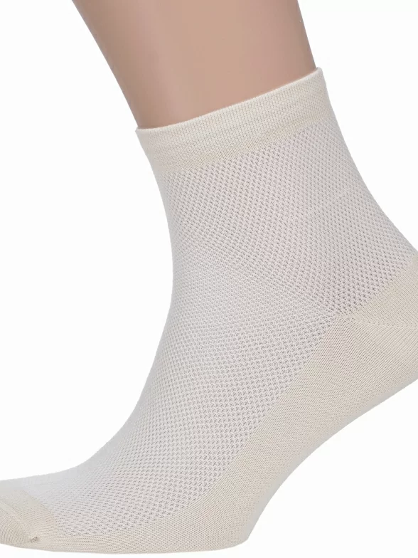 Однотонная укороченная модель с двойным бортом (манжетом резинки) и сетчатой вязкой на верхней части стопы и паголенке. Изготовлены на фабрике в Подмосковье из хлопка (85%) с добавлением полиамида (15%) для повышения износостойкости изделия.