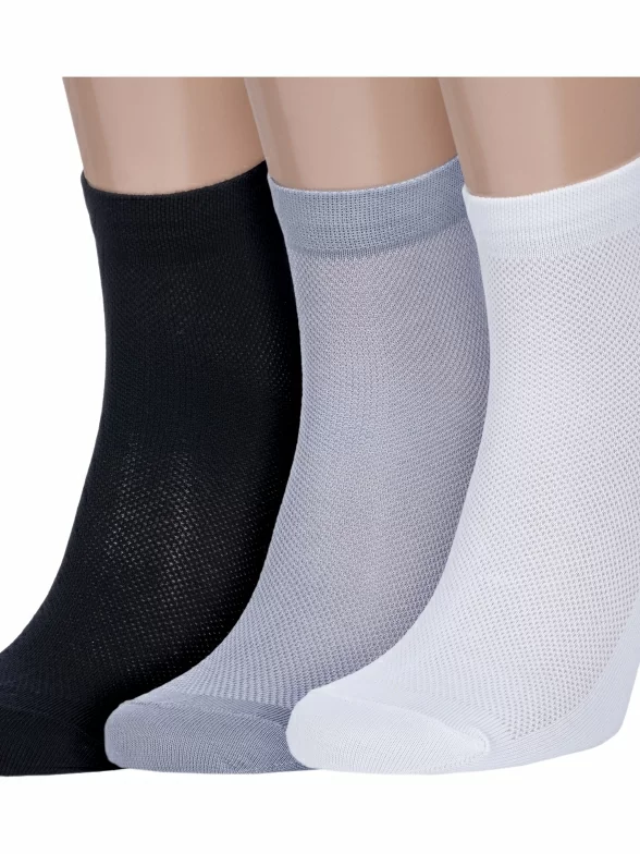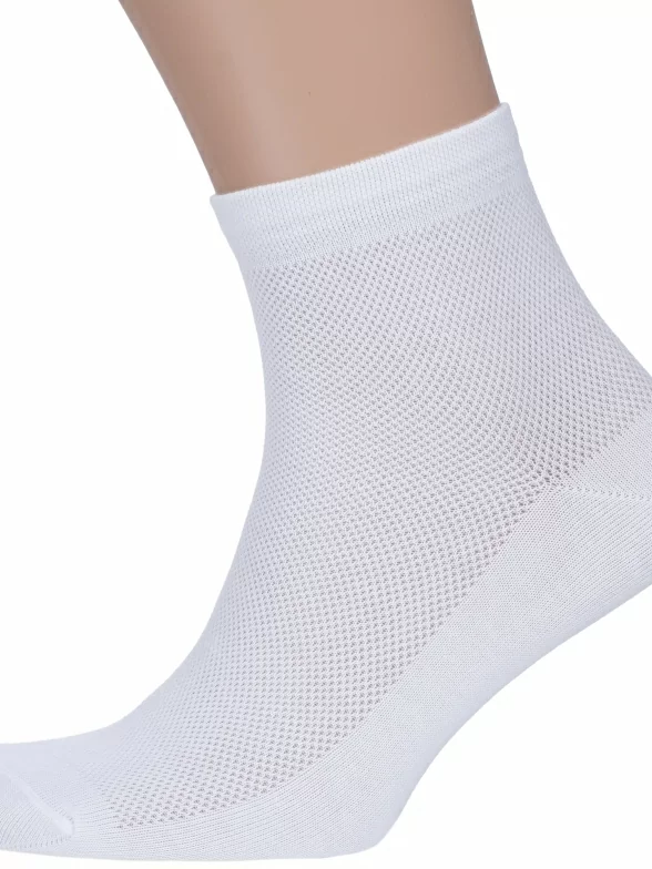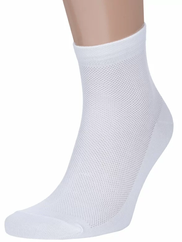 Однотонная укороченная модель с двойным бортом (манжетом резинки) и сетчатой вязкой на верхней части стопы и паголенке. Изготовлены на фабрике в Подмосковье из хлопка (85%) с добавлением полиамида (15%) для повышения износостойкости изделия.