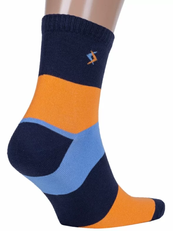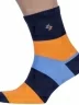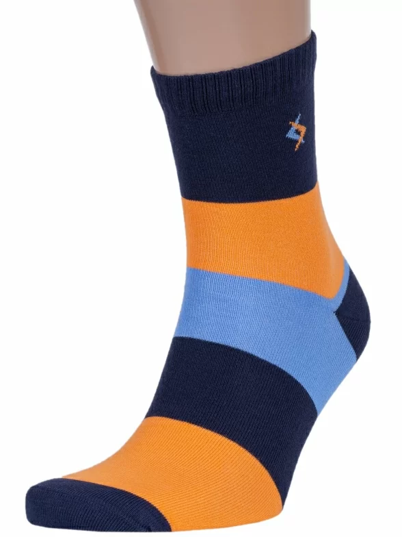 Связаны на фабрике в Подмосковье из хлопка с добавлением полиамида и эластана для износостойкости изделия и комфортной посадки. Укороченная модель оранжевого цвета в полоску с двойным бортом (манжетом резинки).