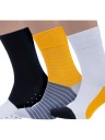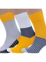 В комплект входят 3 разные пары носков: по 1 паре желто-графитовых в полоску, серых с полосатой подошвой и желто-белых с графитовой вставкой посередине. Носки поставляются с индивидуальными фабричными этикетками в обычном или курьер-пакете.