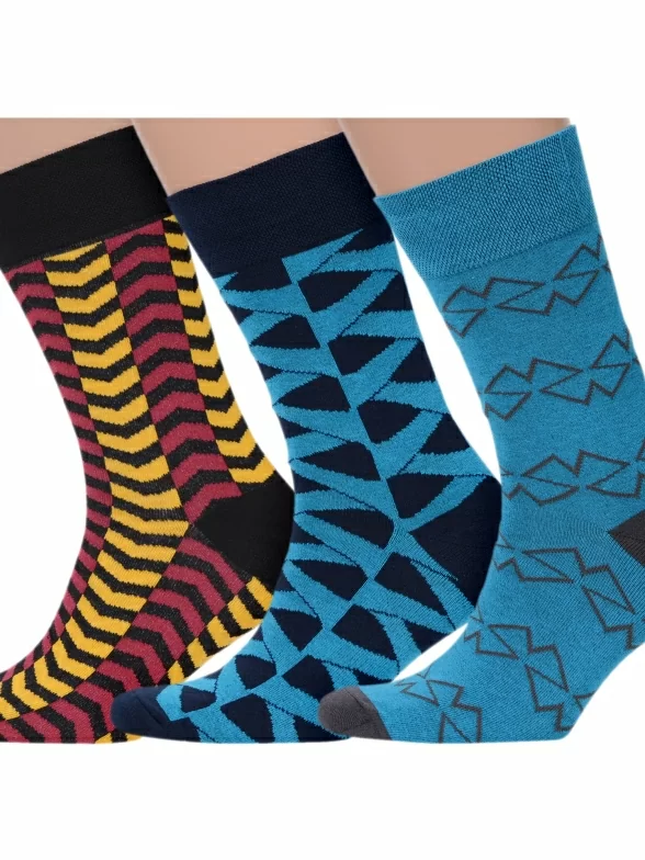 В комплект входят 3 разные пары носков: по 1 паре темно-синих с контрастным плетеным узором, разноцветных с зигзагами и темно-голубых с ломаными линиями. Носки поставляются с индивидуальными фабричными этикетками в обычном или курьер-пакете.
