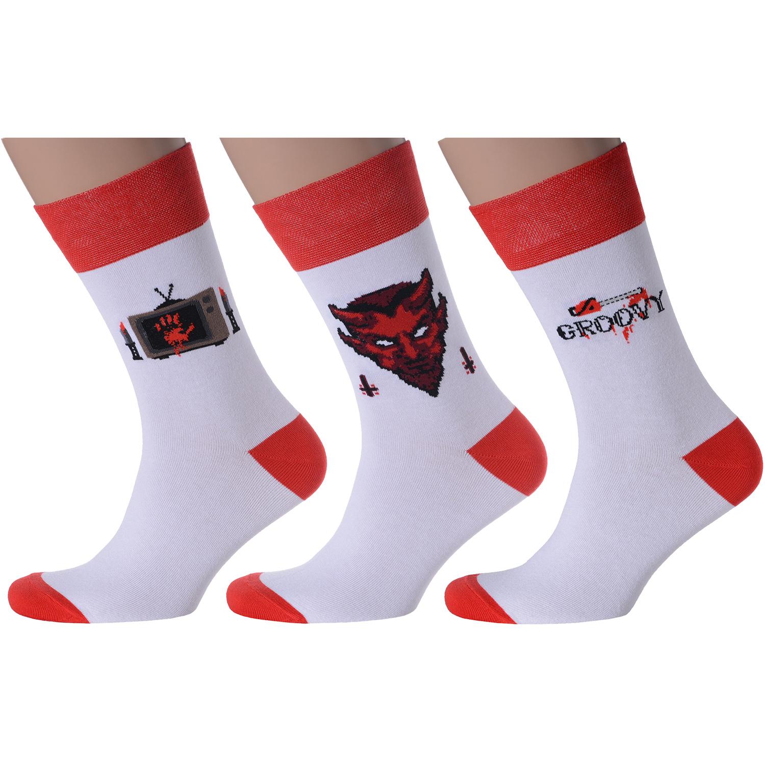 Комплект мужских носков бренда MSCLUB с принтами на хоррор-тематику: по 1 паре с дьяволом, с отпечатком, с бензопилой и надписью "безбашенный".