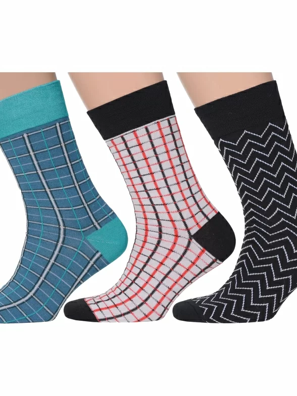 В комплект входят 3 пары носков: по 1 паре черных с зигзагами, темно-бирюзовых и светло-серых в клетку. Поставляются с индивидуальными фабричными этикетками в обычном или курьер-пакете.
