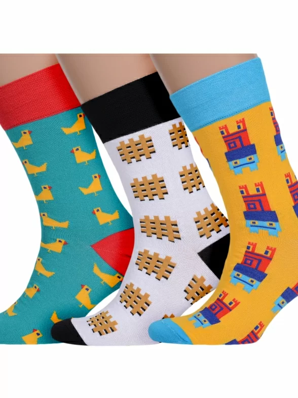 В комплект входят 3 разные пары носков: по 1 паре белых с решетками, бирюзовых с цыплятами и желтых с монстрами. Поставляются с индивидуальными фабричными этикетками в обычном или курьер-пакете.