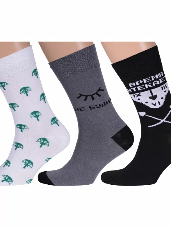 В комплект входят 3 пары носков: по 1 паре белых со слонами, темно-серых ("антрацит") с надписью "Не буди" и черных с надписью "Время утекает". Поставляются с индивидуальными фабричными этикетками в обычном или курьер-пакете.