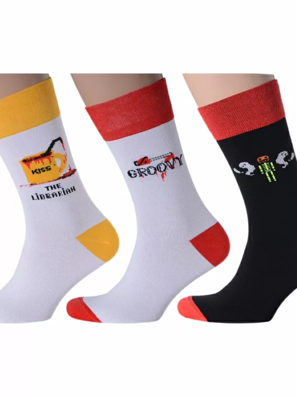 В комплект входят 3 разные пары носков: по 1 паре бело-красных с надписью "Groovy" (с англ. "Круто"), черно-красных со скелетом и бело-желтых с надписью "Kiss the librarian" (с англ. "Поцелуй библиотекаря"). Носки поставляются с индивидуальными фабричными этикетками в обычном или курьер-пакете.