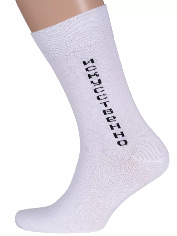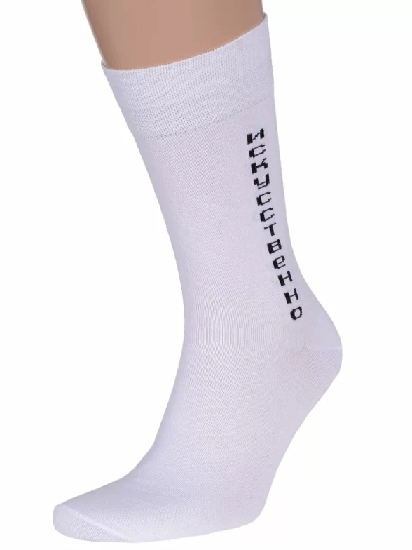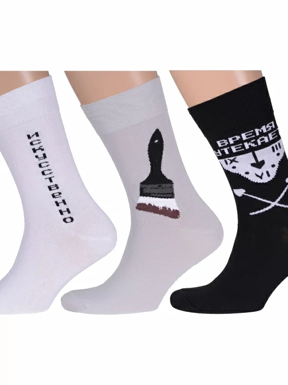 В комплект входят 3 пары носков: по 1 паре белых с надписью "Искусственно", светло-серых с кисточкой и черных с надписью "Время утекает". Поставляются с индивидуальными фабричными этикетками в обычном или курьер-пакете.