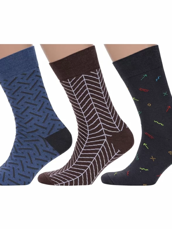 В комплект входят 3 разные пары носков: по 1 паре джинсовых с полосами и точками, коричневых с узором "елочка" и темно-серых с разноцветными знаками. Носки поставляются с индивидуальными фабричными этикетками в обычном или курьер-пакете.